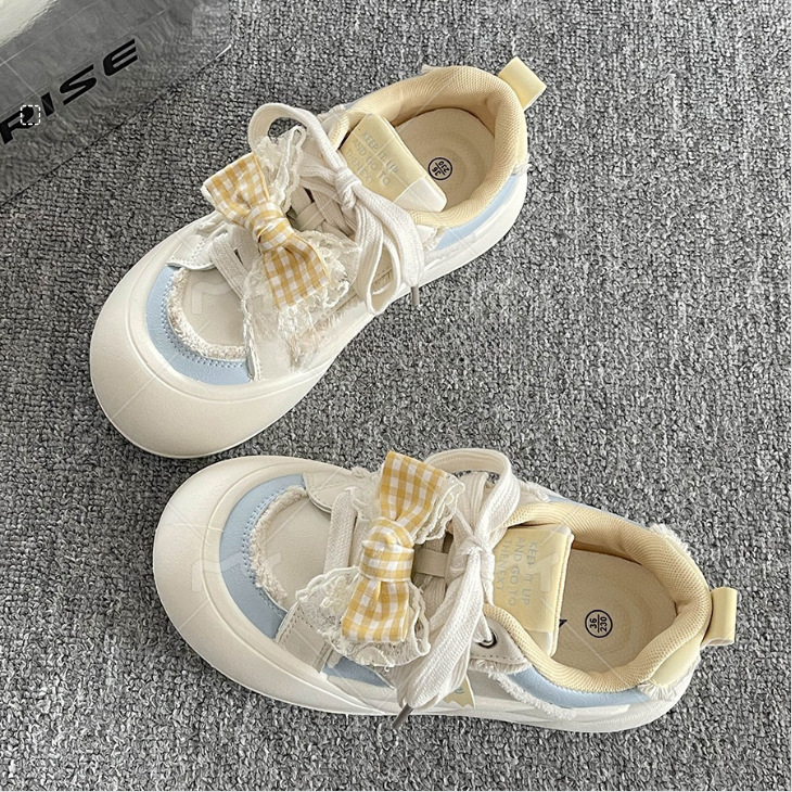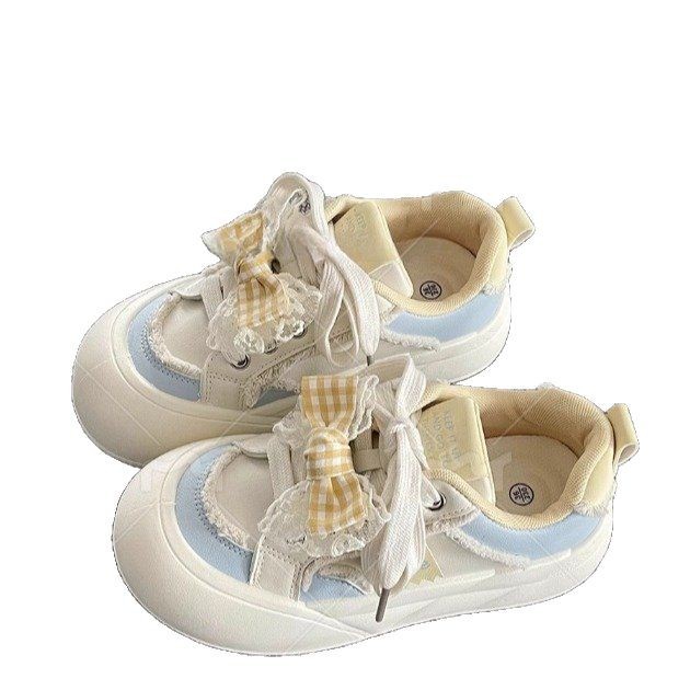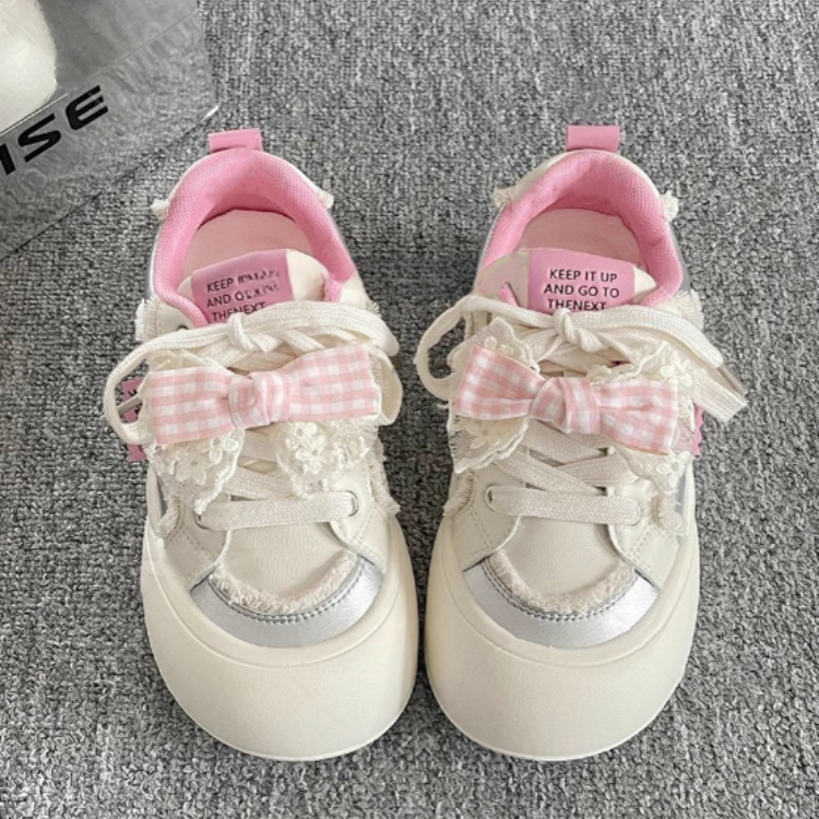 蝴蝶结原创小众皮面粉色板鞋女2025新款百搭春季面包鞋厚底小白鞋