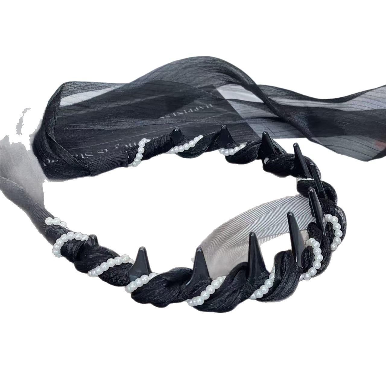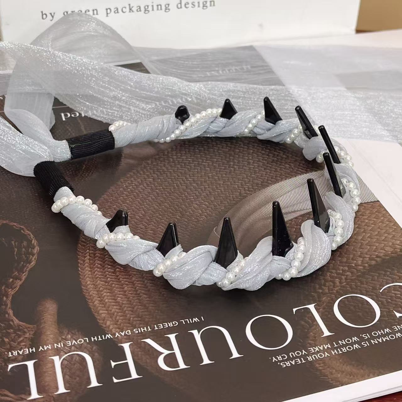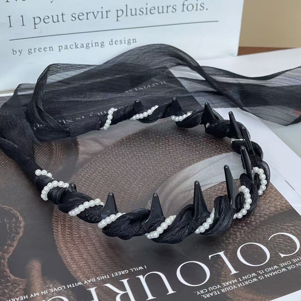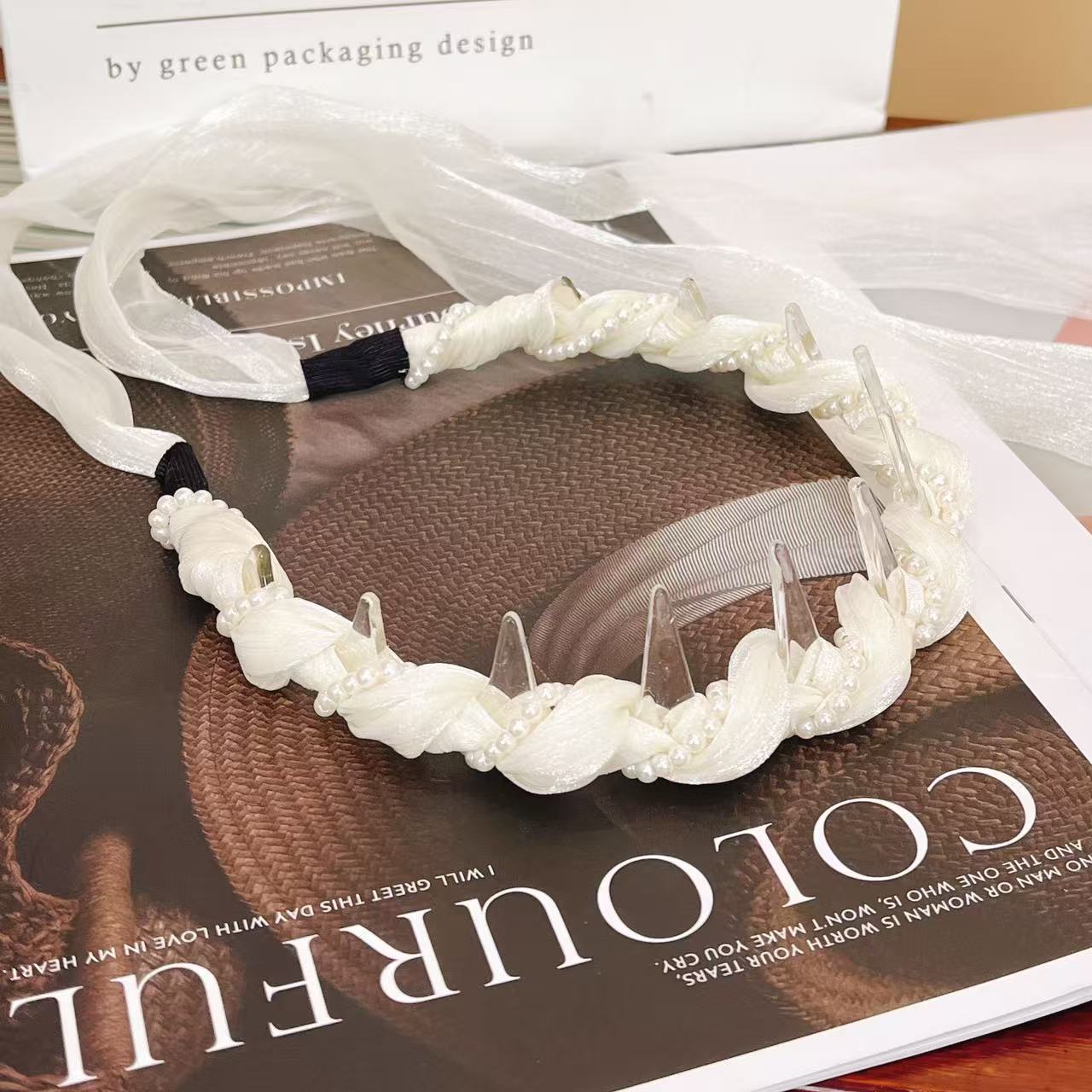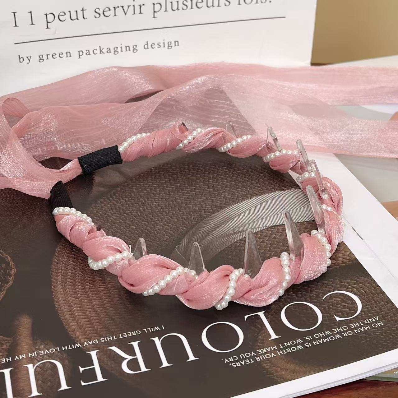 珍珠网纱绕布~新款高颅顶珍珠网纱绕布飘带发箍甜妹氛围
