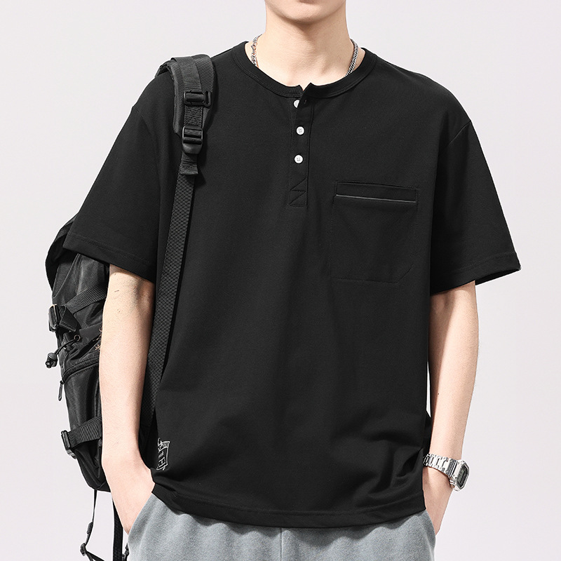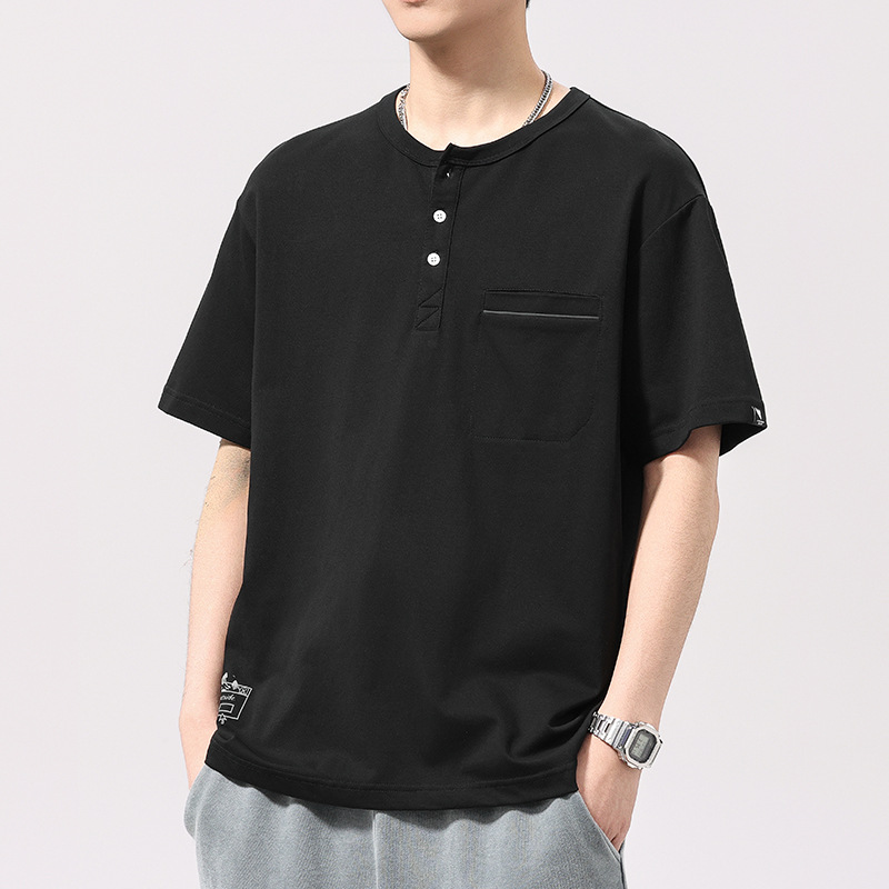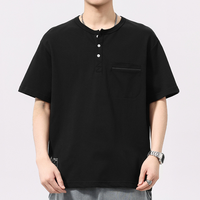 白色短袖t恤男士2025年夏季新款纽扣圆领半袖上衣潮流休闲体恤男