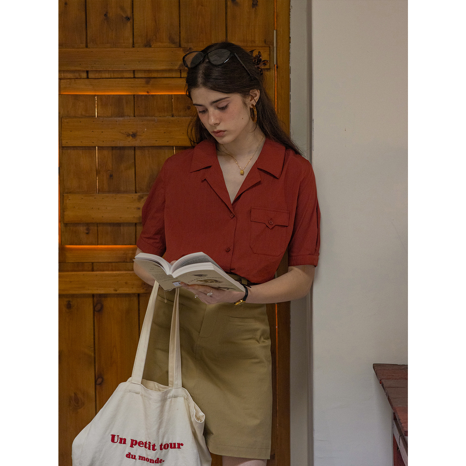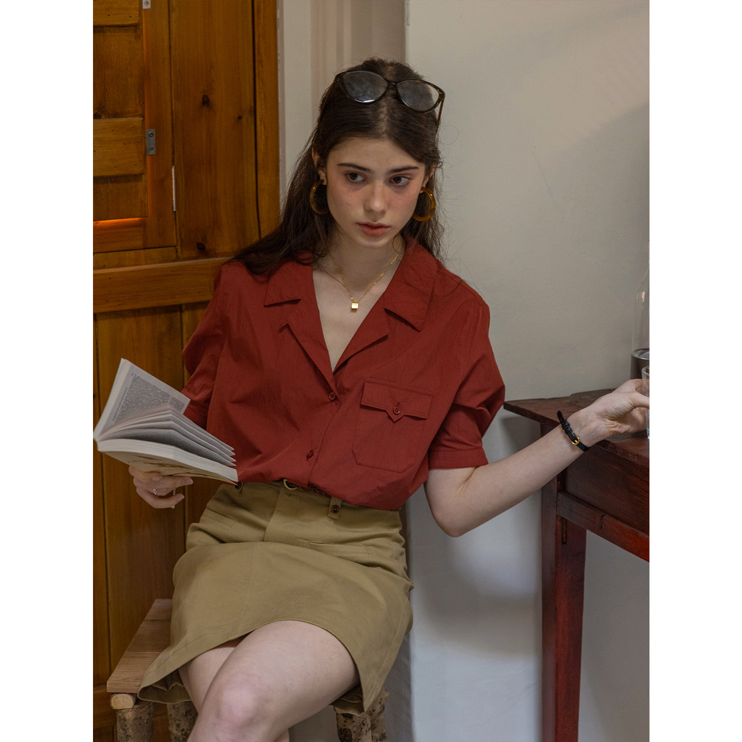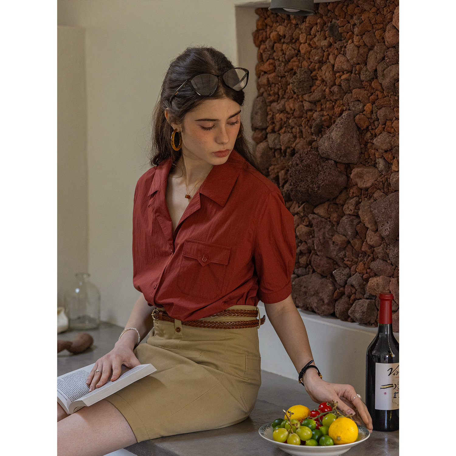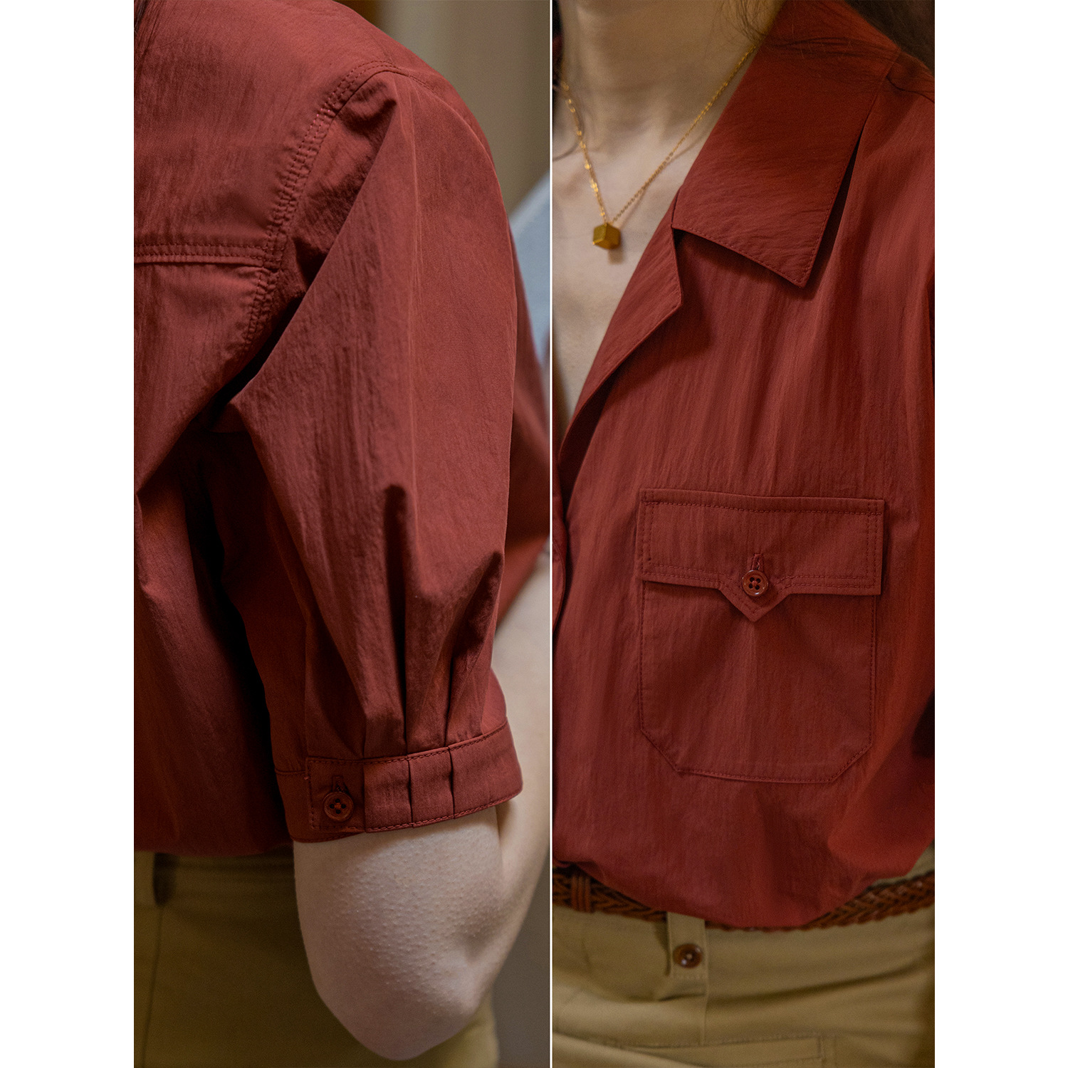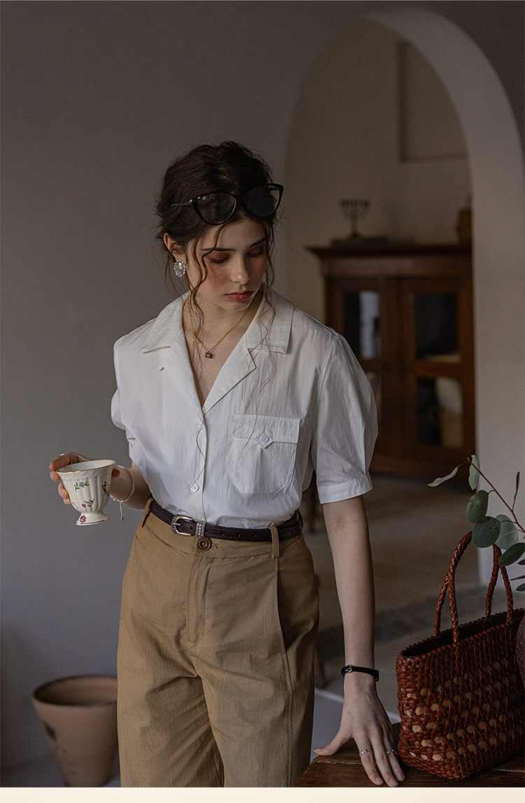 Dailyart“佩里斯日记”通勤感西装领短袖棉锦肌理感双色衬衫上衣