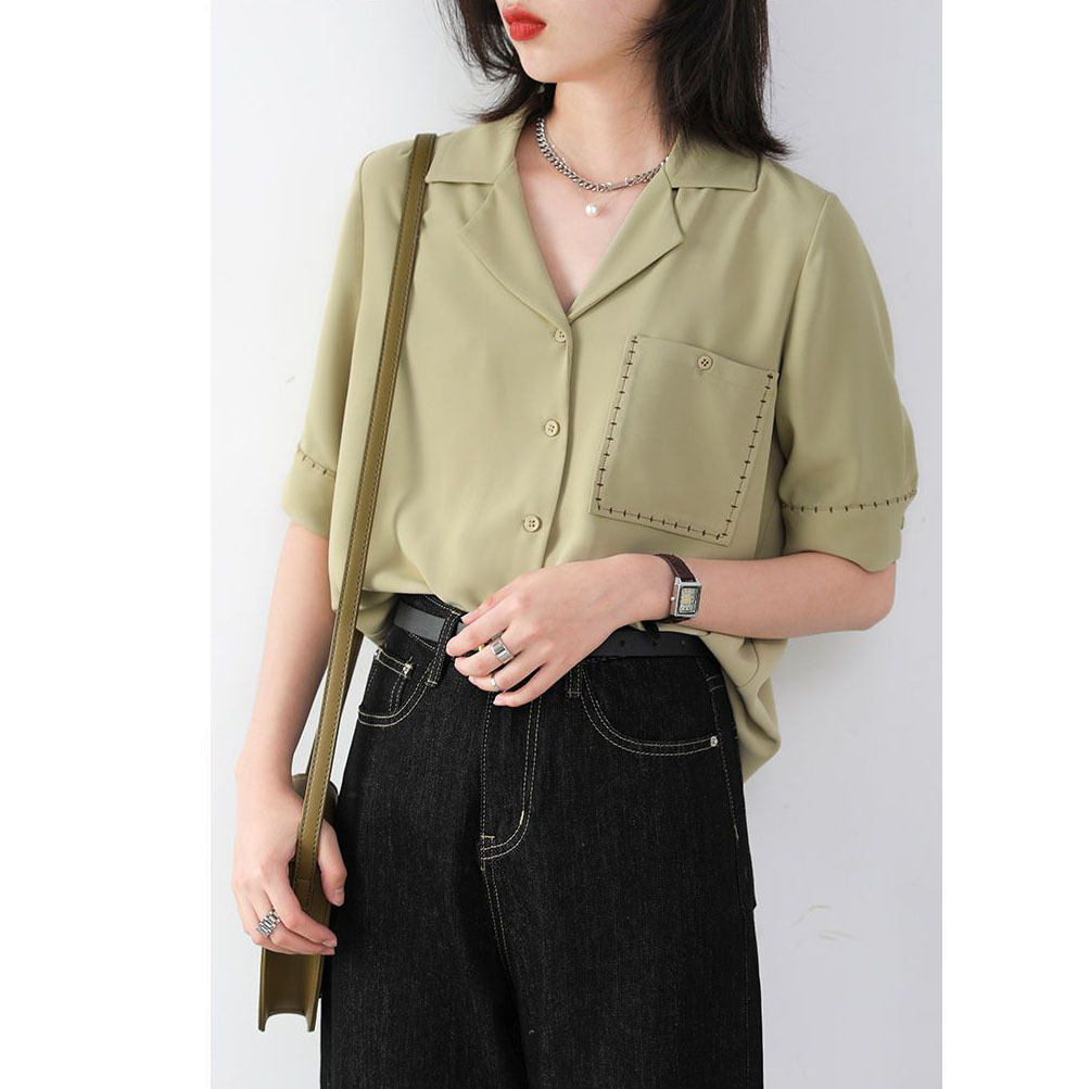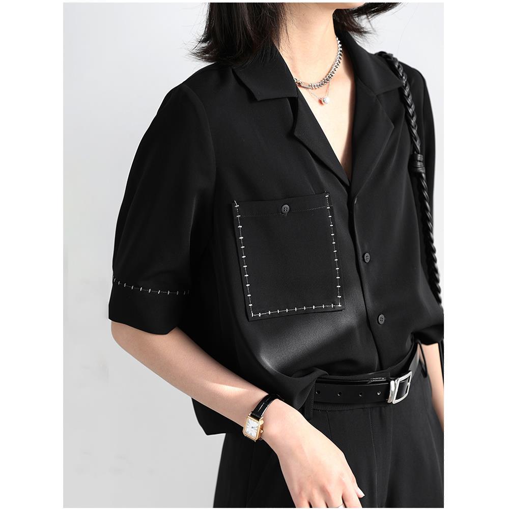 CHICVEN东方幻想气质设计感撞色缝线宽松绑带翻领衬衫女上衣
