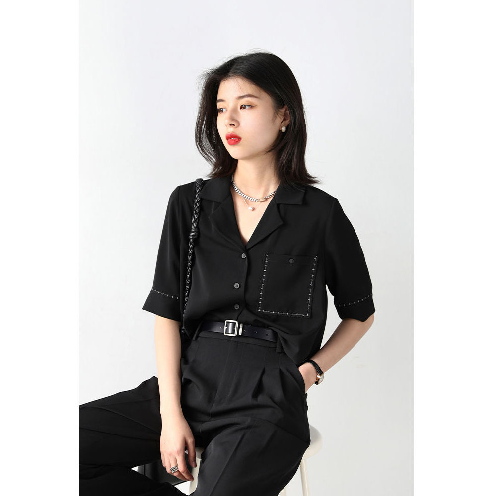 复古Polo领气质有版型抽皱黑白细格百搭通勤衬衫女夏新款
