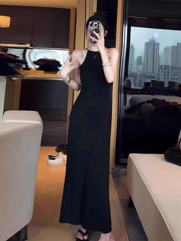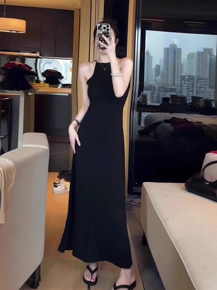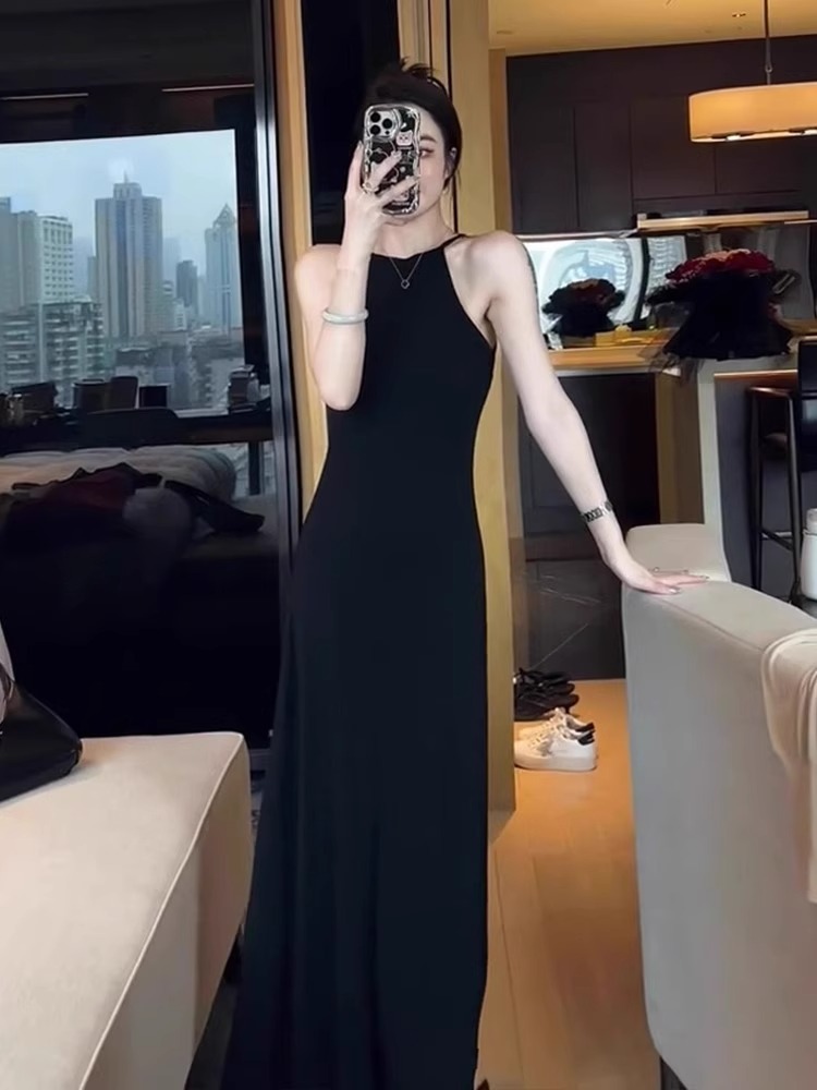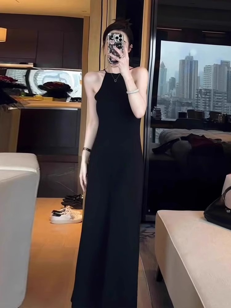 茶歇法式温柔风收腰又甜又辣赫本风长款黑色无袖挂脖吊带连衣裙女