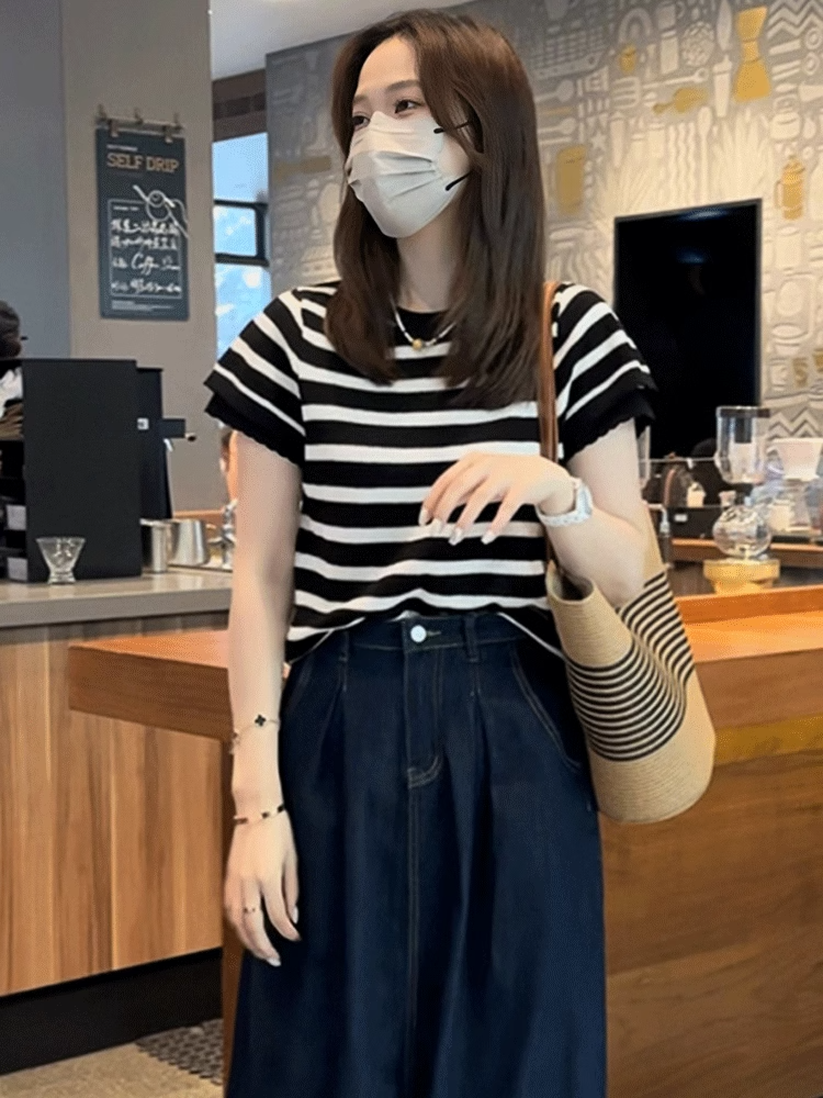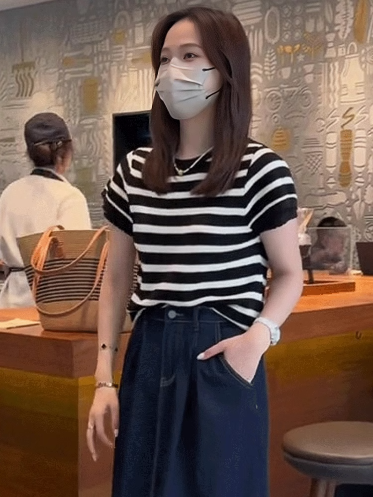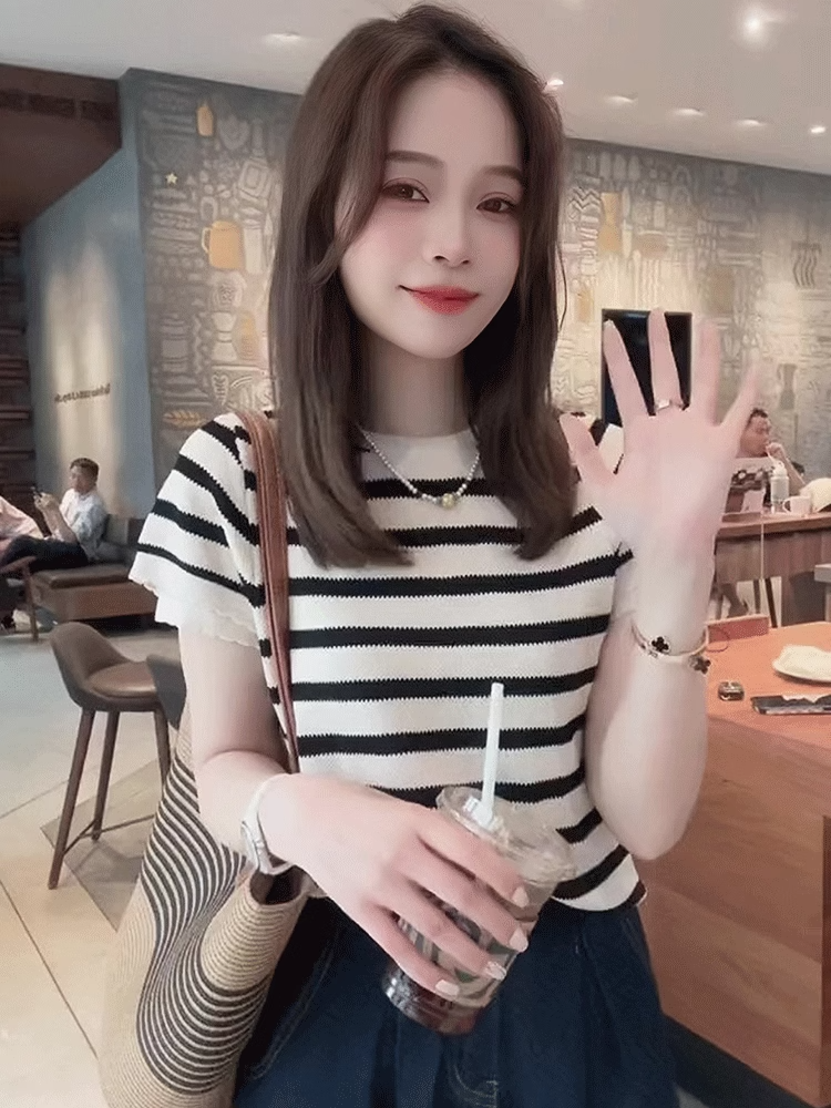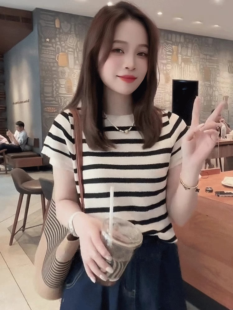 条纹冰丝针织衫短袖t恤女2025新款爆款夏季洋气时尚修身短款上衣