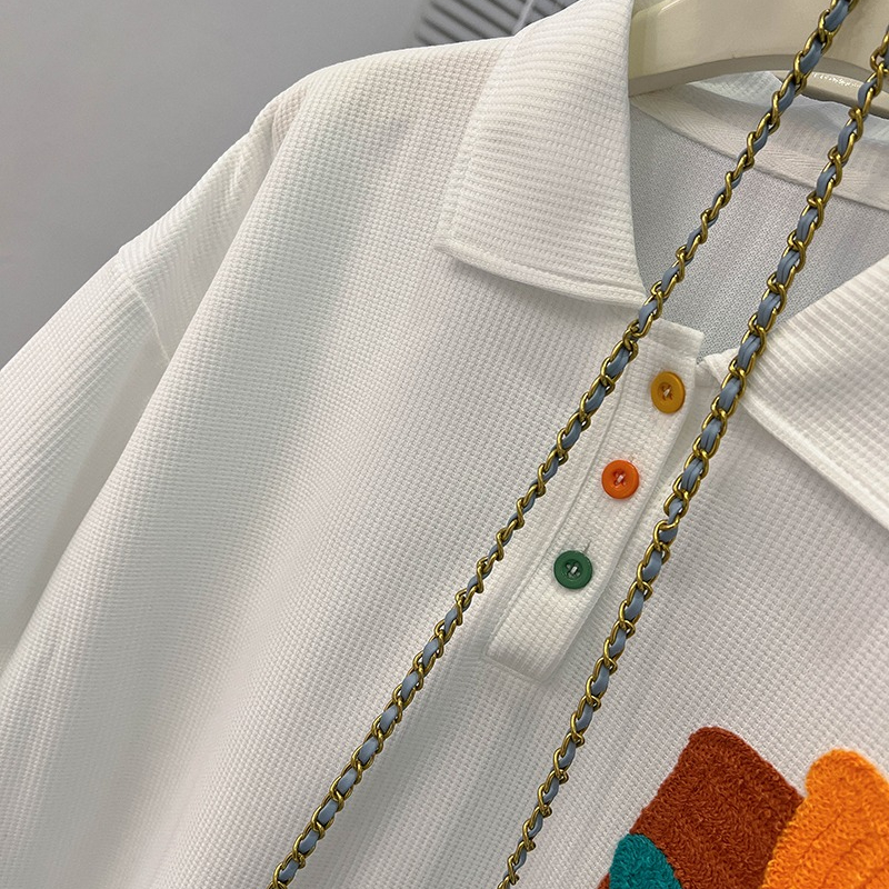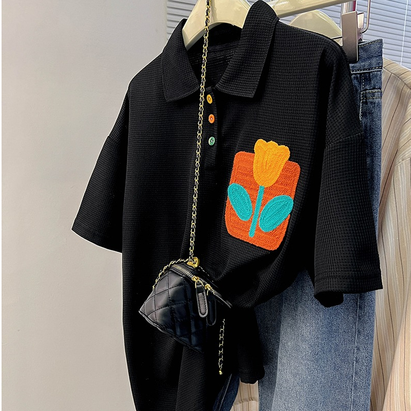 小众华夫格刺绣翻领短袖t恤女夏季新款设计感宽松显瘦半袖上衣ins