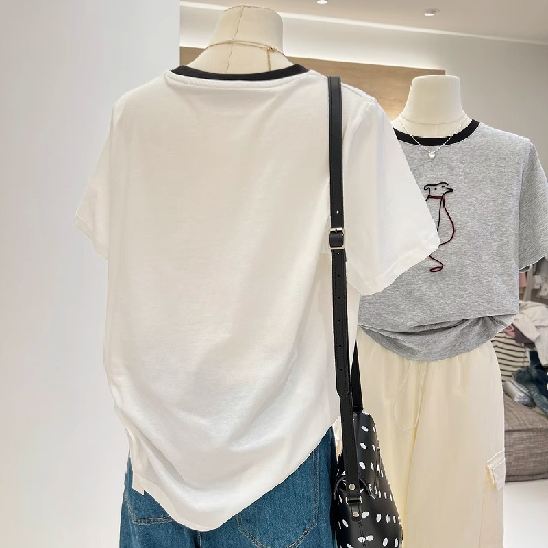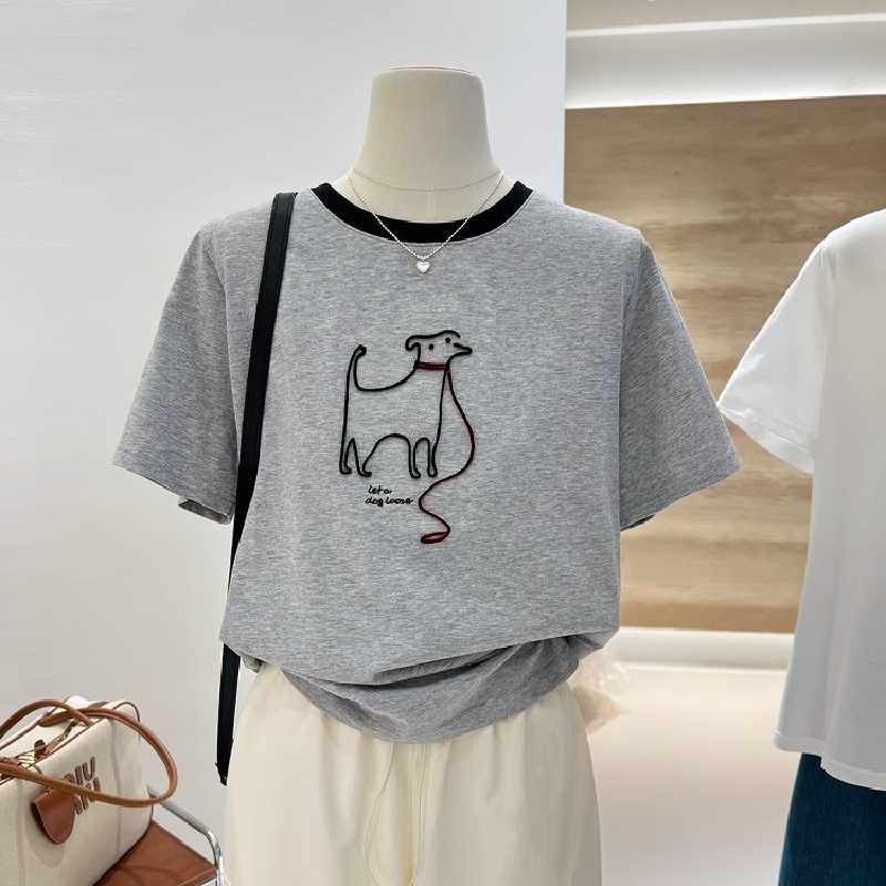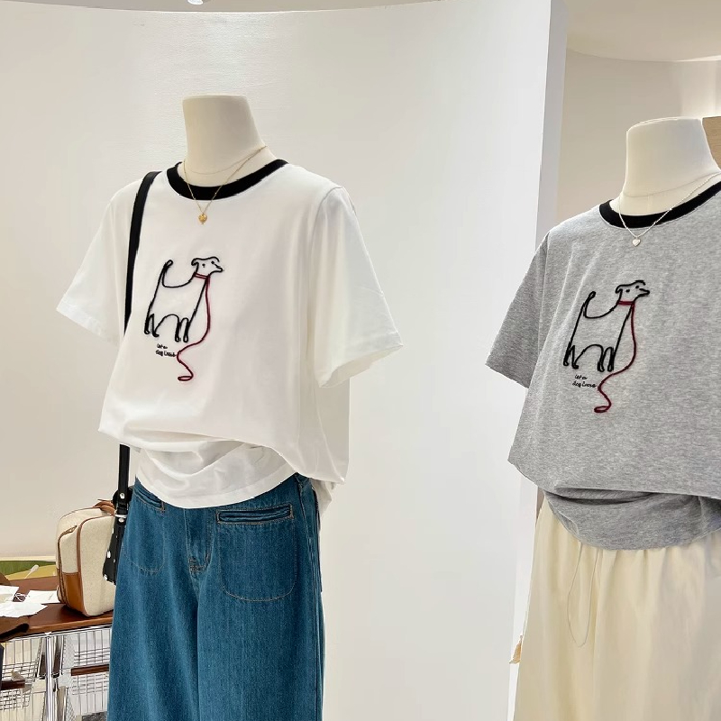 新款卡通刺绣正肩圆领遮肚子短袖T恤女夏季大码时尚减龄休闲上衣