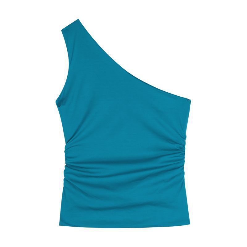 【跨境批发】纯欲辣妹斜肩设计感收腰新款湖蓝色名媛显瘦背心上衣