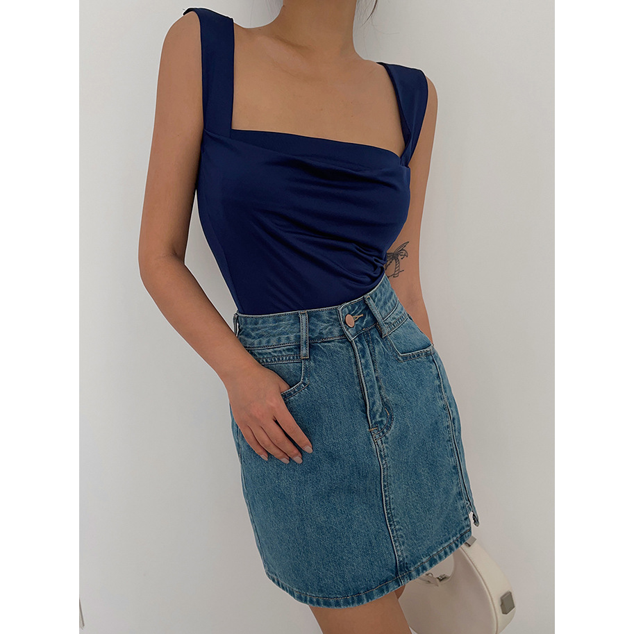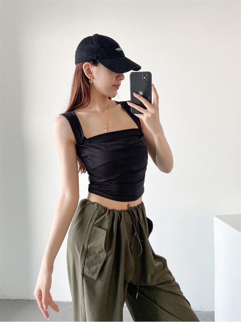 2025夏季性感方领低胸显瘦打底背心女纯色褶皱短款无袖吊带上衣潮