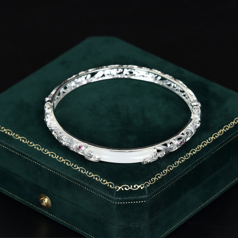 古法镀金银花丝S925银和田玉镂空手镯古风送女士情人节生日礼物