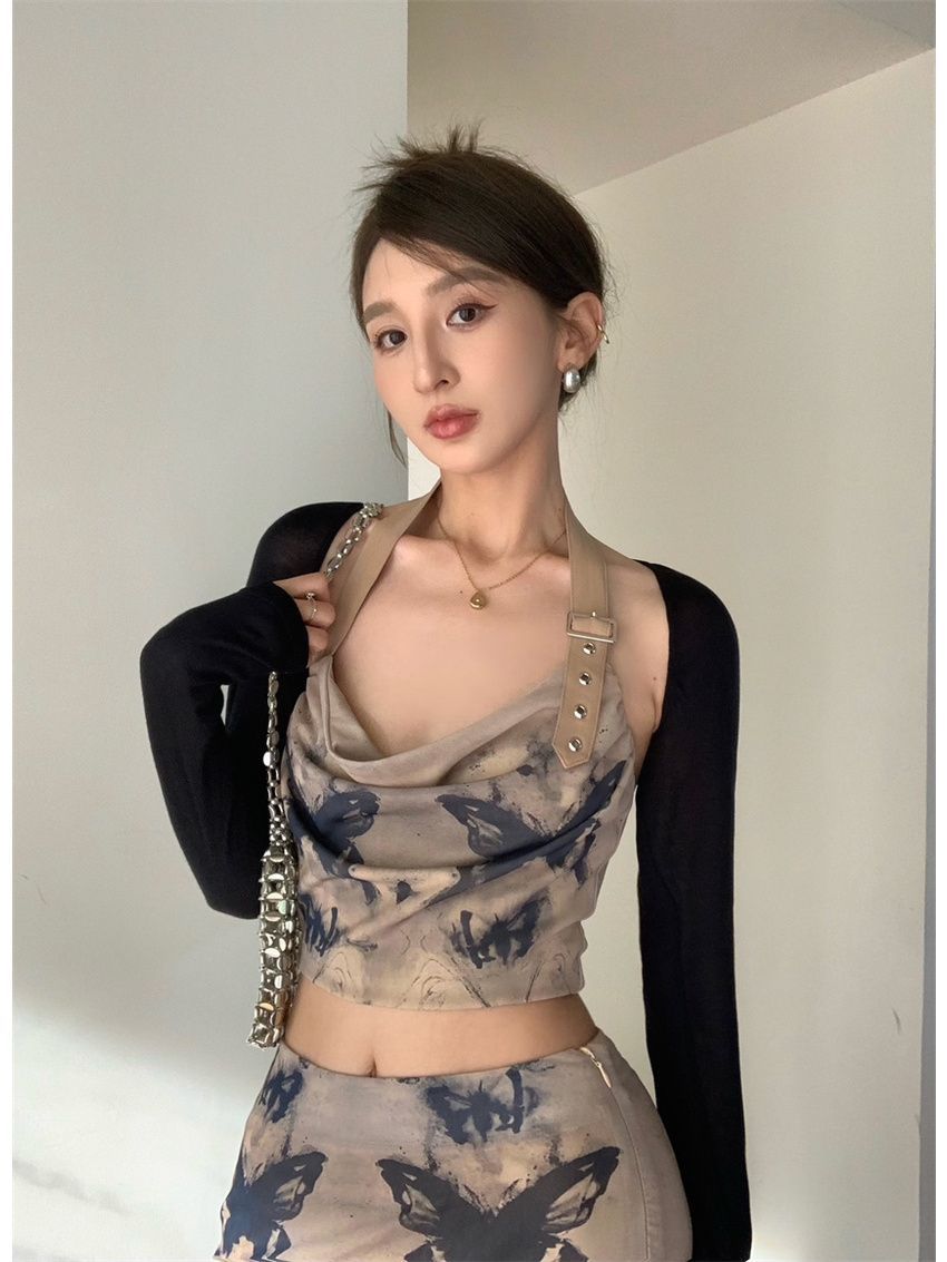 【跨境批发】蝴蝶水墨抹胸挂脖吊带背心夏季低胸修身短款上衣女
