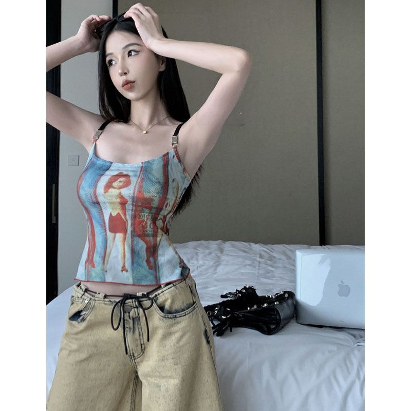 泰国复古辣妹小吊带背心女2025夏季新款性感紧身印花内搭短款上衣