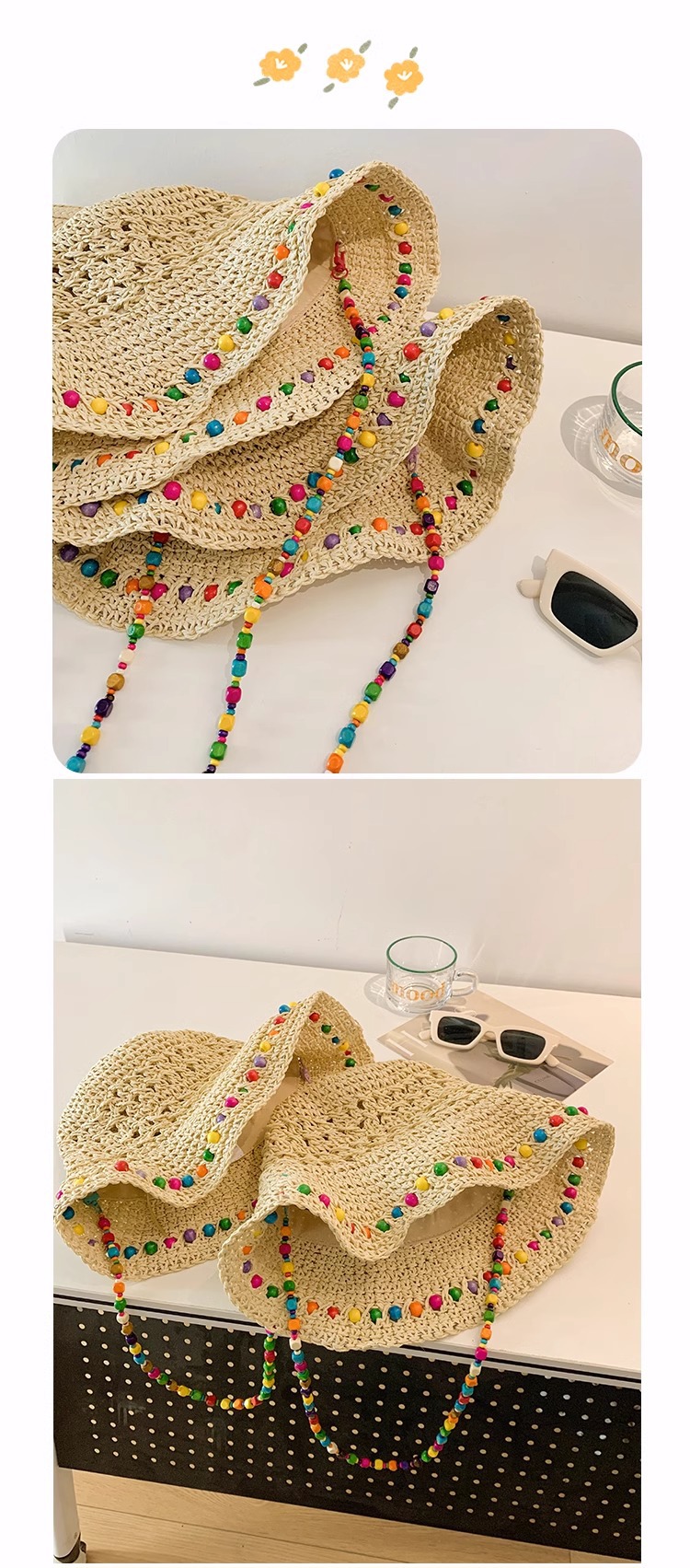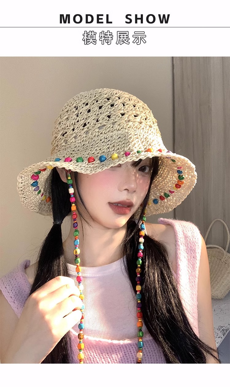泫雅风彩色木珠草帽女夏季镂空大帽檐遮阳防晒帽可折叠渔夫帽子潮