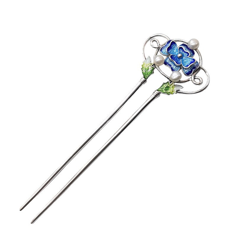 S925银复古景泰蓝珐琅花卉发钗批发女款镶淡水珍珠银发簪