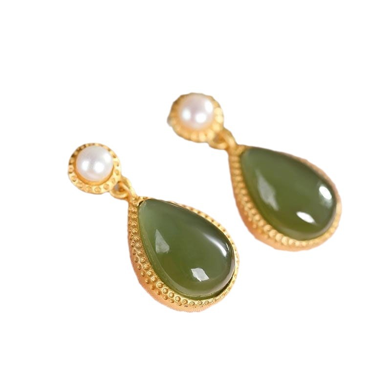 新款S925纯银金色和田青玉耳坠女士个性水滴气质简约时尚优雅耳饰