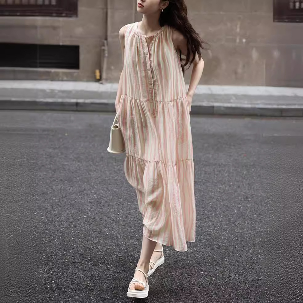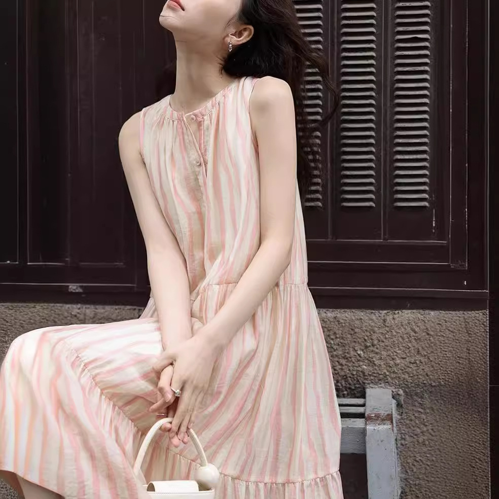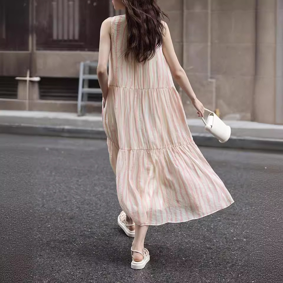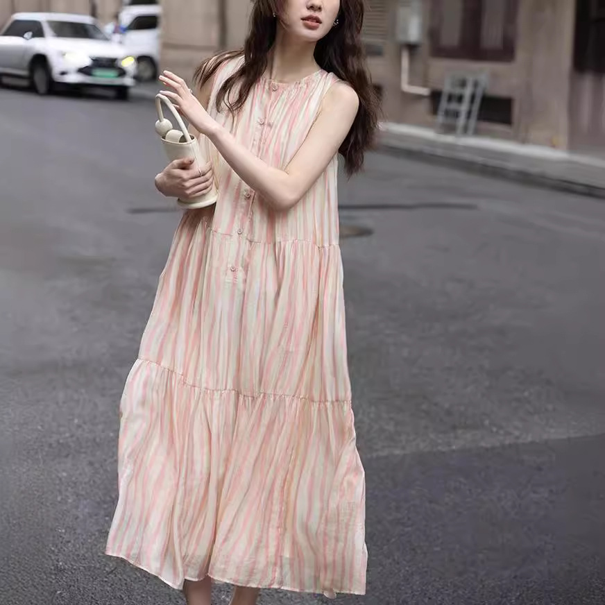 1313气质女神!80%天丝水波纹粉条纹背心连衣裙垂坠长裙