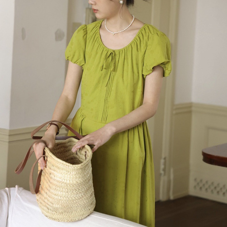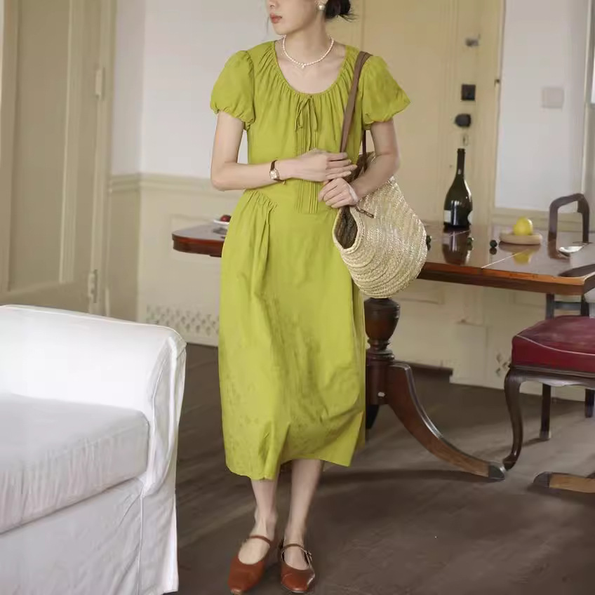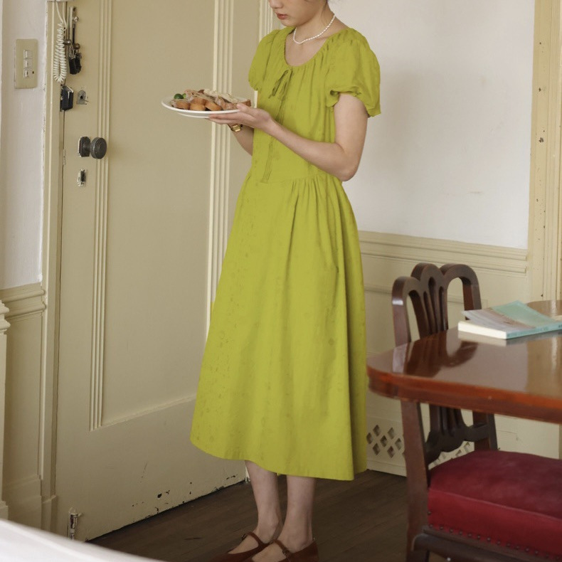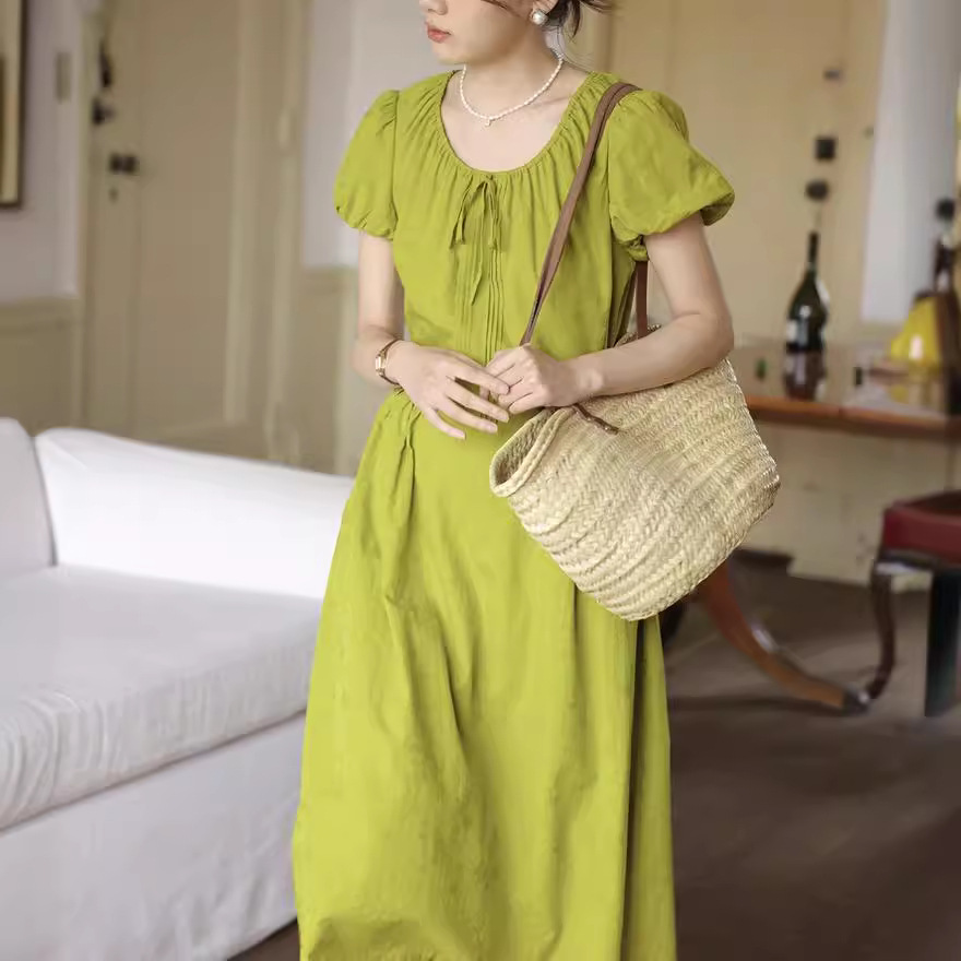 soligther法式复古短袖连衣裙女春季新款泡泡袖收腰长裙