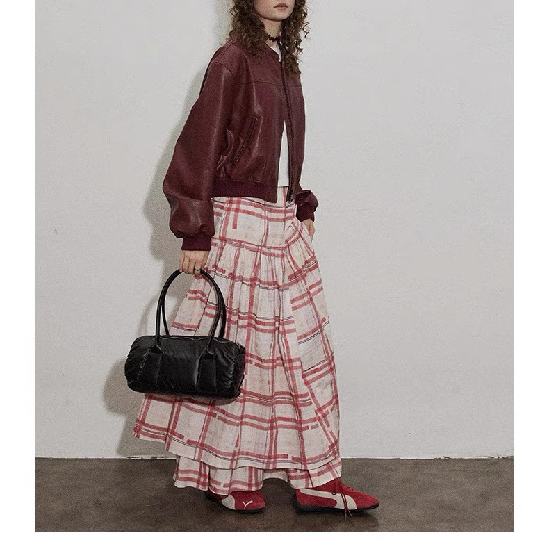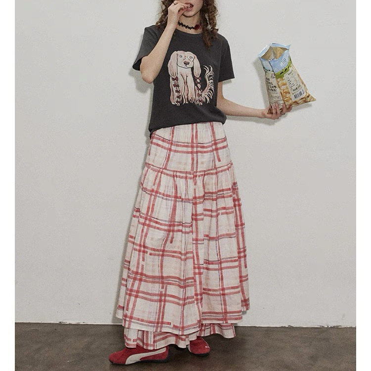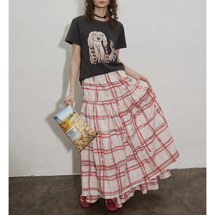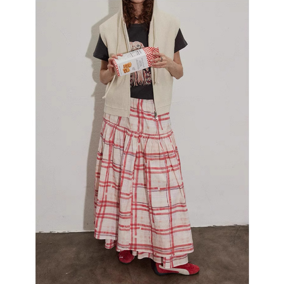 [云烟里] 格子撞色拼接设计感半身裙女宽松显瘦休闲长裙