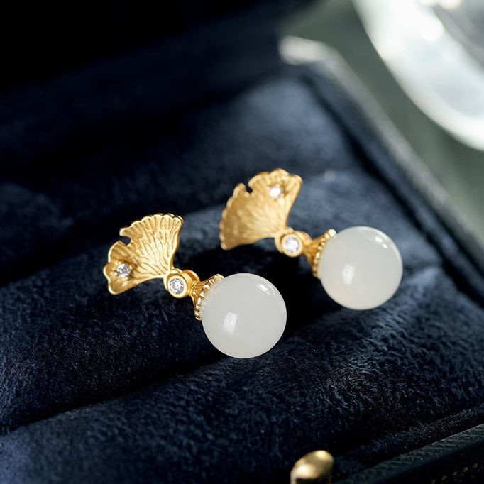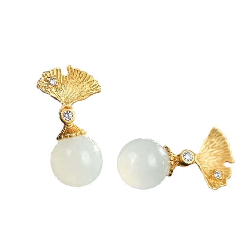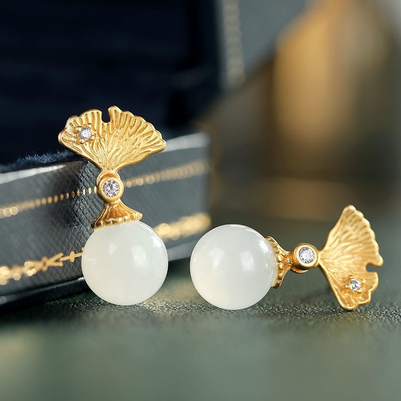 S925纯银银杏叶圆珠耳环天然和田白玉耳坠气质简约精致耳环