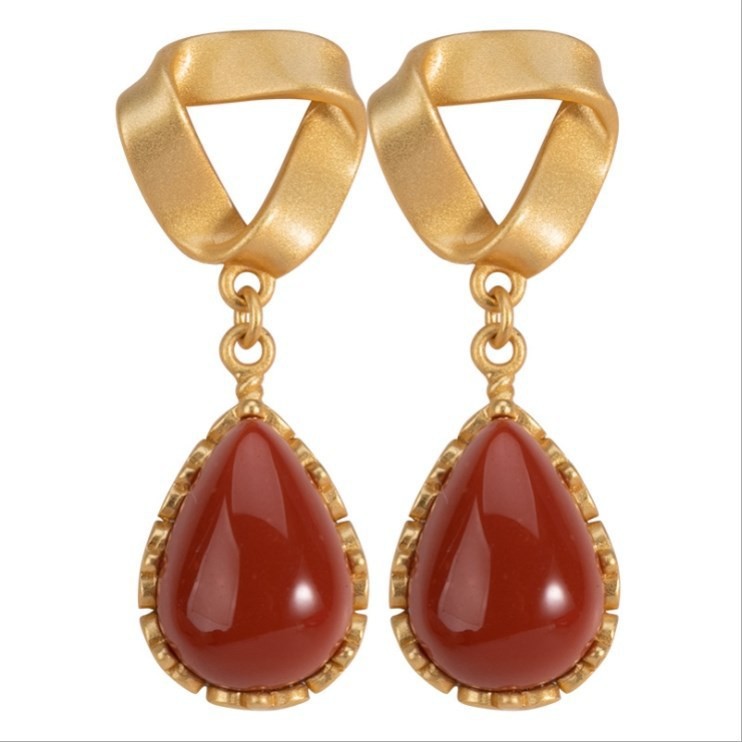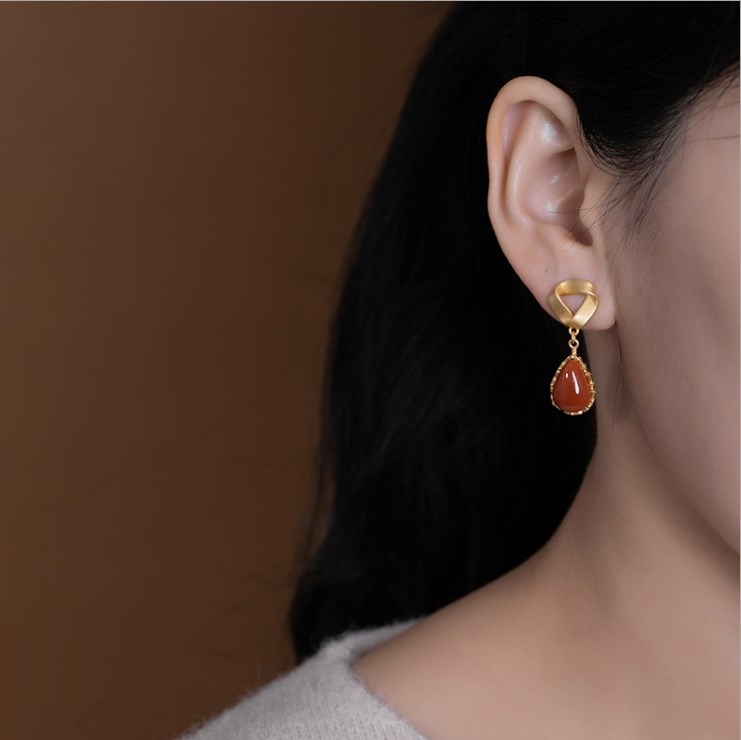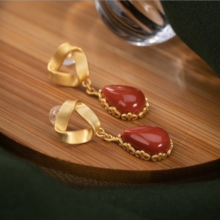 镶嵌国色南红耳钉设计宫廷风时尚简约耳饰气质女轻奢耳环饰品