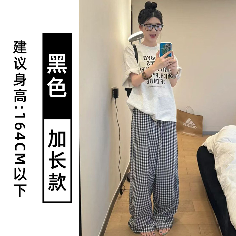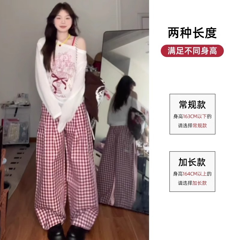 红色复古格子裤子女夏季宽松阔腿bf慵懒风高腰显瘦拖地直筒长裤子