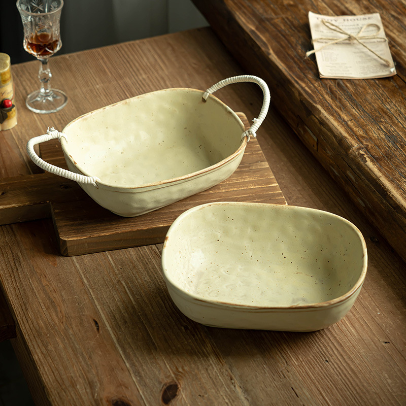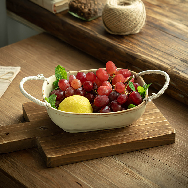 【侘寂粗陶款】双耳手提编绳果盘日式复古餐具家用菜碗水果沙拉碗