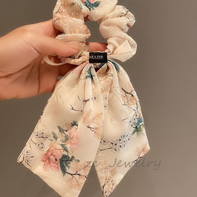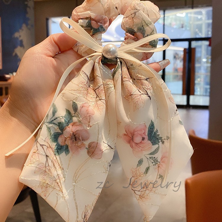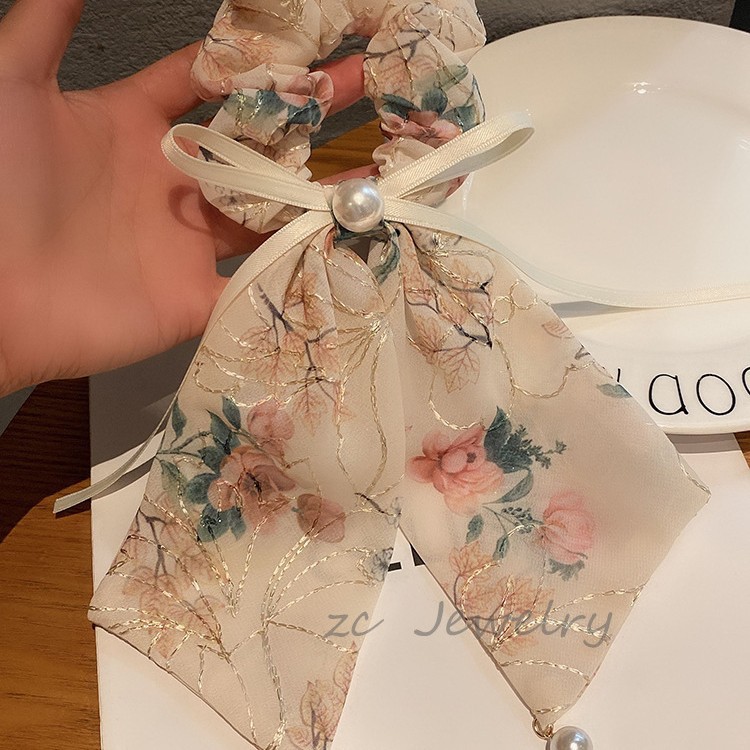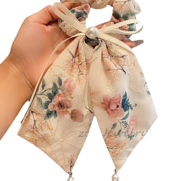 高级感温柔米色刺绣蝴蝶结飘带肠圈女韩版碎花珍珠气质发圈新款