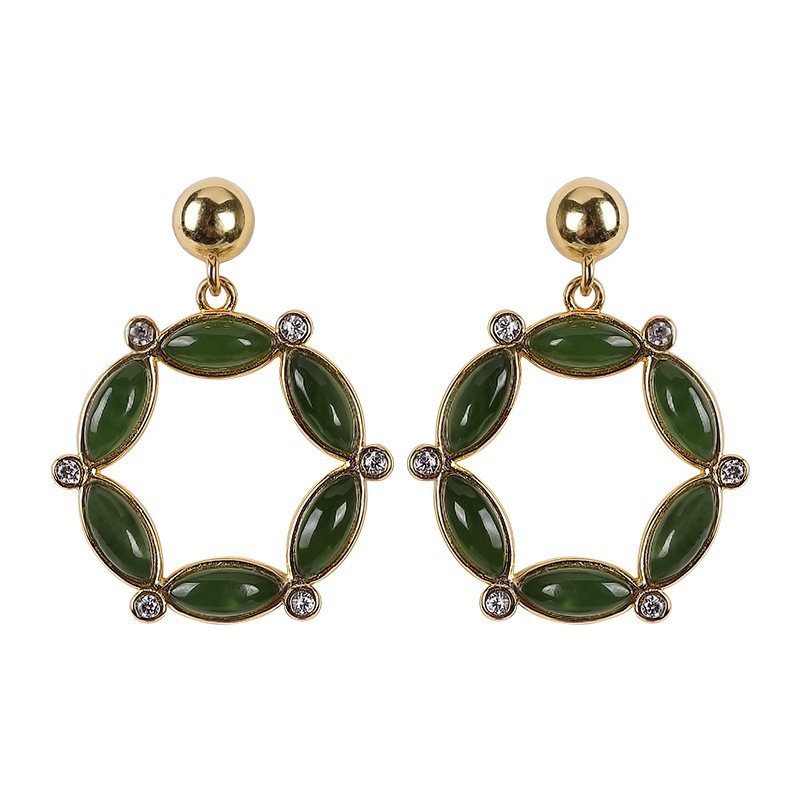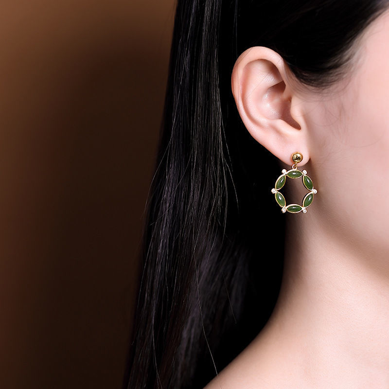 s925银针镀18K金碧玉绿玉女款个性时尚花环圆环精致大气耳环耳饰