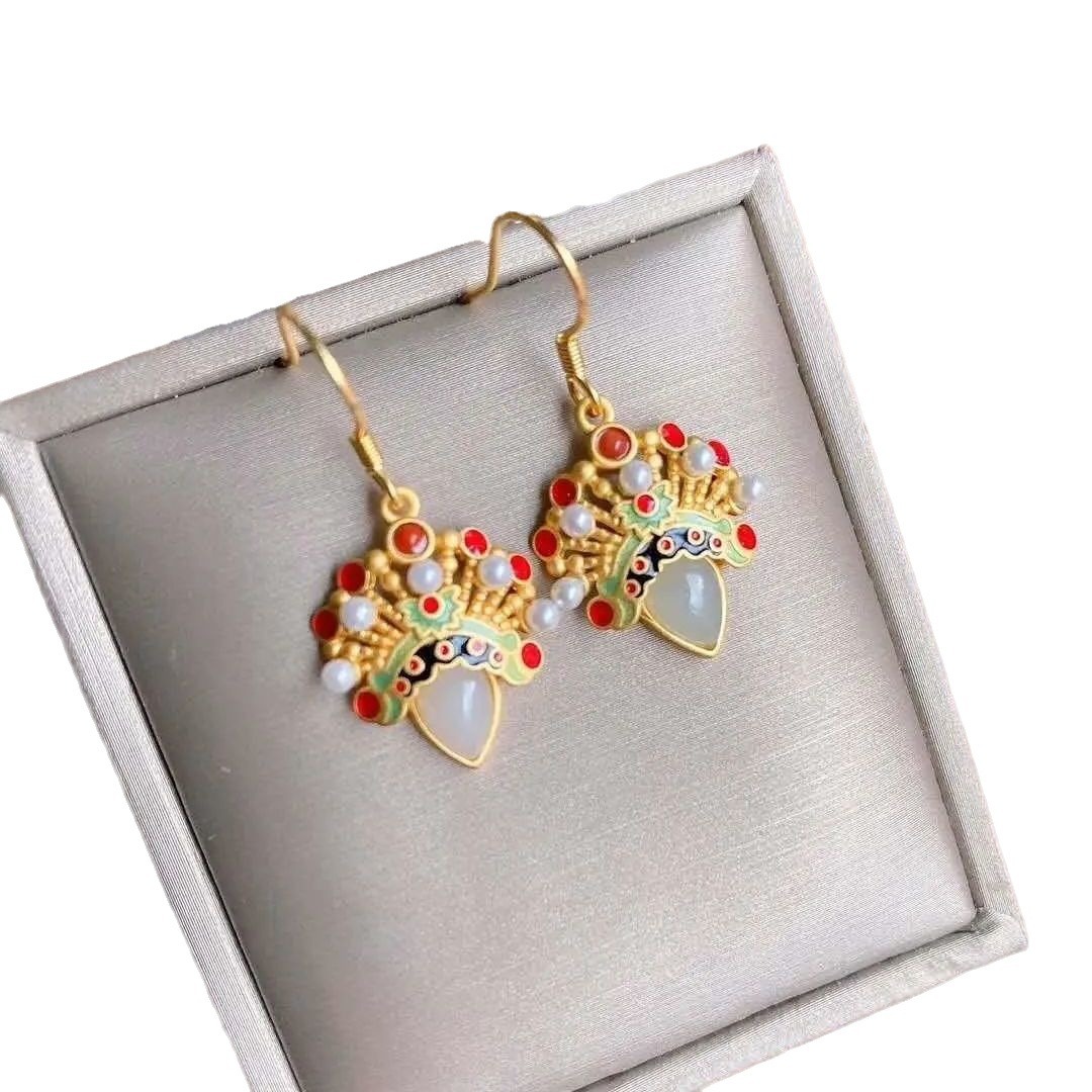 中国风耳坠女纯银镶嵌白玉耳环水滴古典形刀马旦京剧脸谱耳饰女