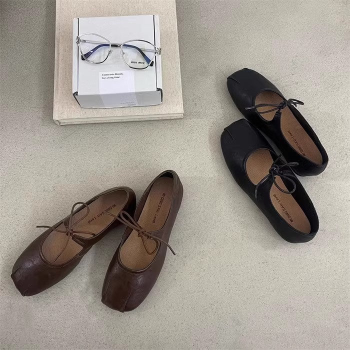 复古风方头褶皱浅口单鞋女2025春秋新款蝴蝶结镂空平底玛丽珍鞋