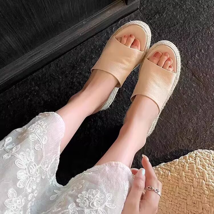 夏季新品草编厚底凉拖鞋女一字型露趾中跟舒适拖鞋女式凉拖鞋