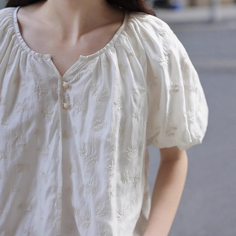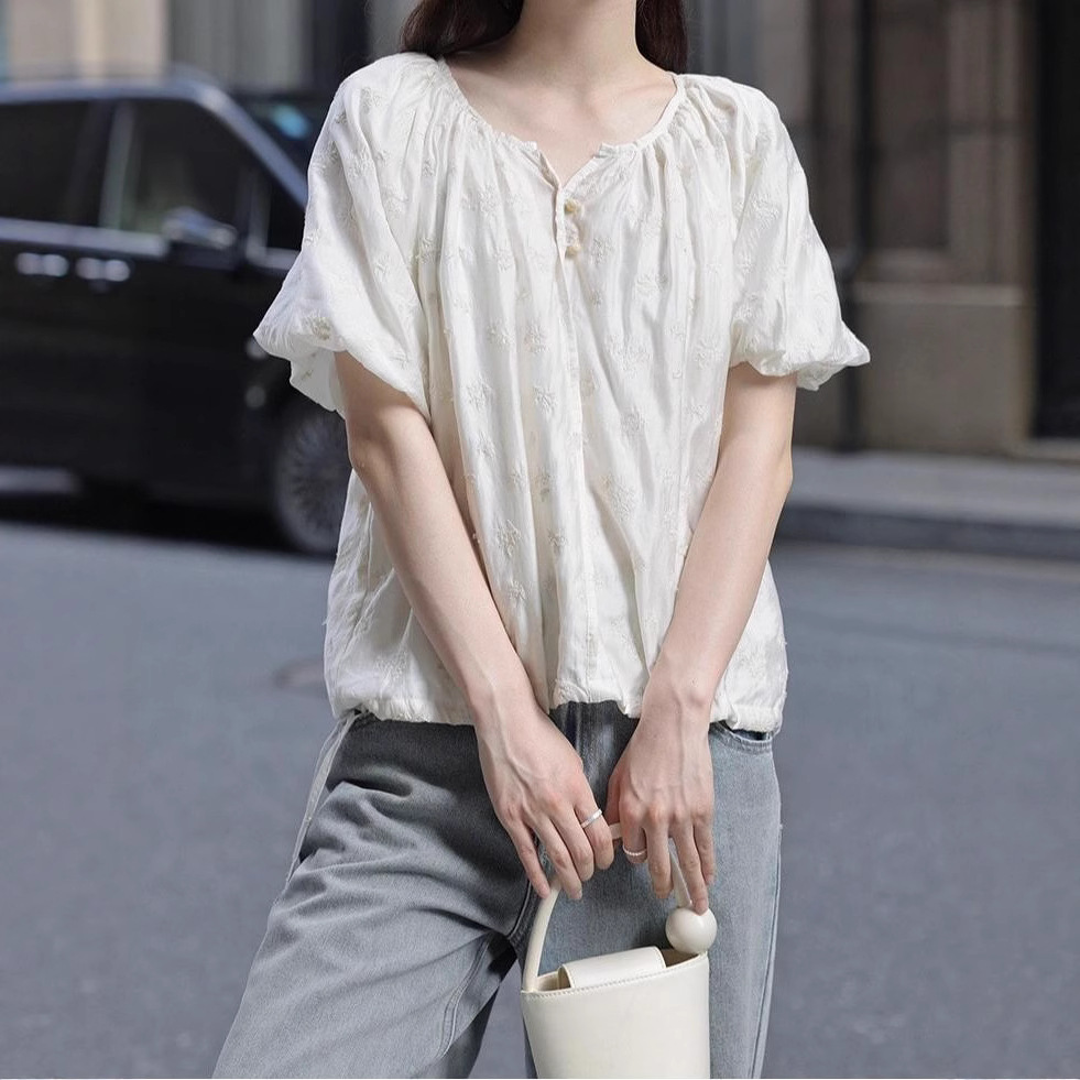 法式精美钩花90%凉感天丝灯笼袖短袖雪纺衫上衣女夏