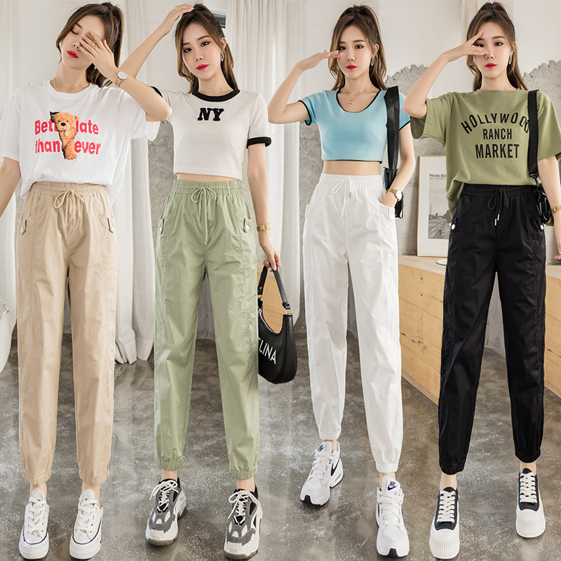 洗水棉休闲裤女夏新款韩版高腰宽松百搭九分裤工装哈伦裤女