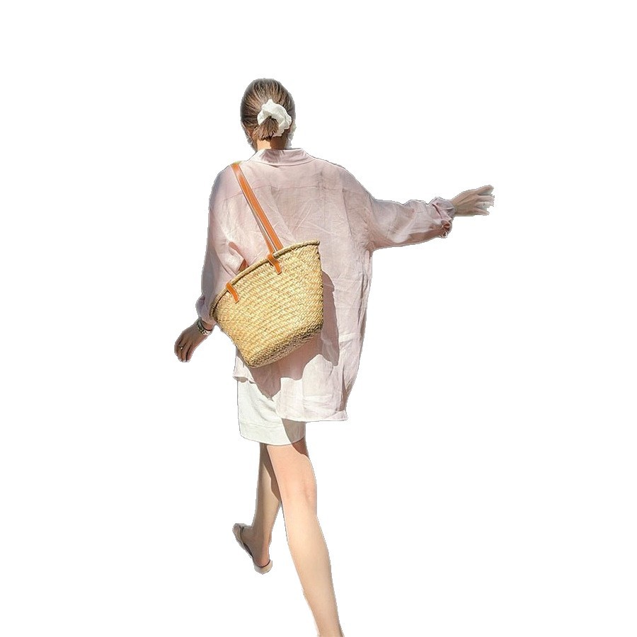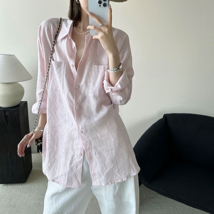 高级感亚麻长袖淡粉色衬衫女夏季上衣外套宽松气质棉麻衬衣
