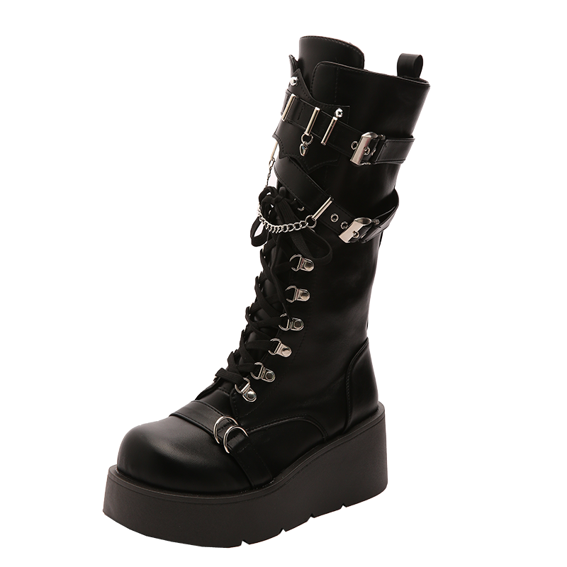 金属朋克风坡跟骑士靴女2025春秋季新款百搭厚底长筒靴