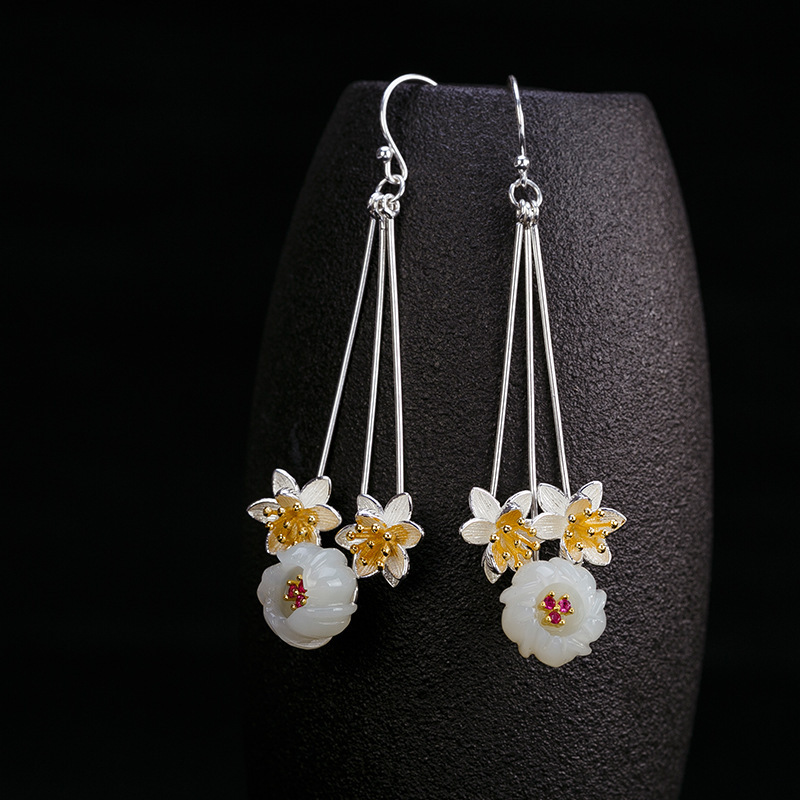S925纯银和田玉梅花耳坠复古个性文艺女士耳环流苏耳钉节日礼物