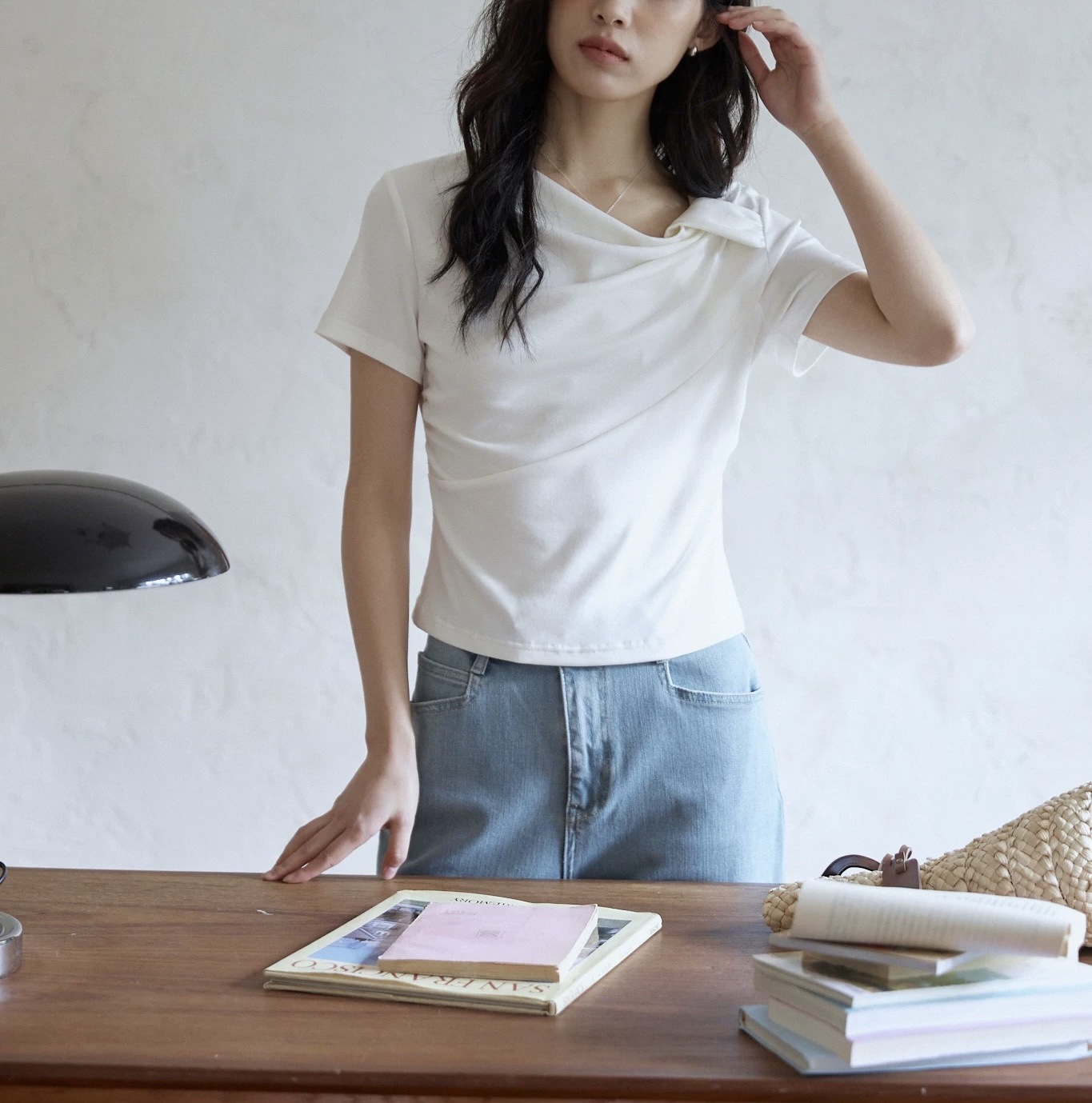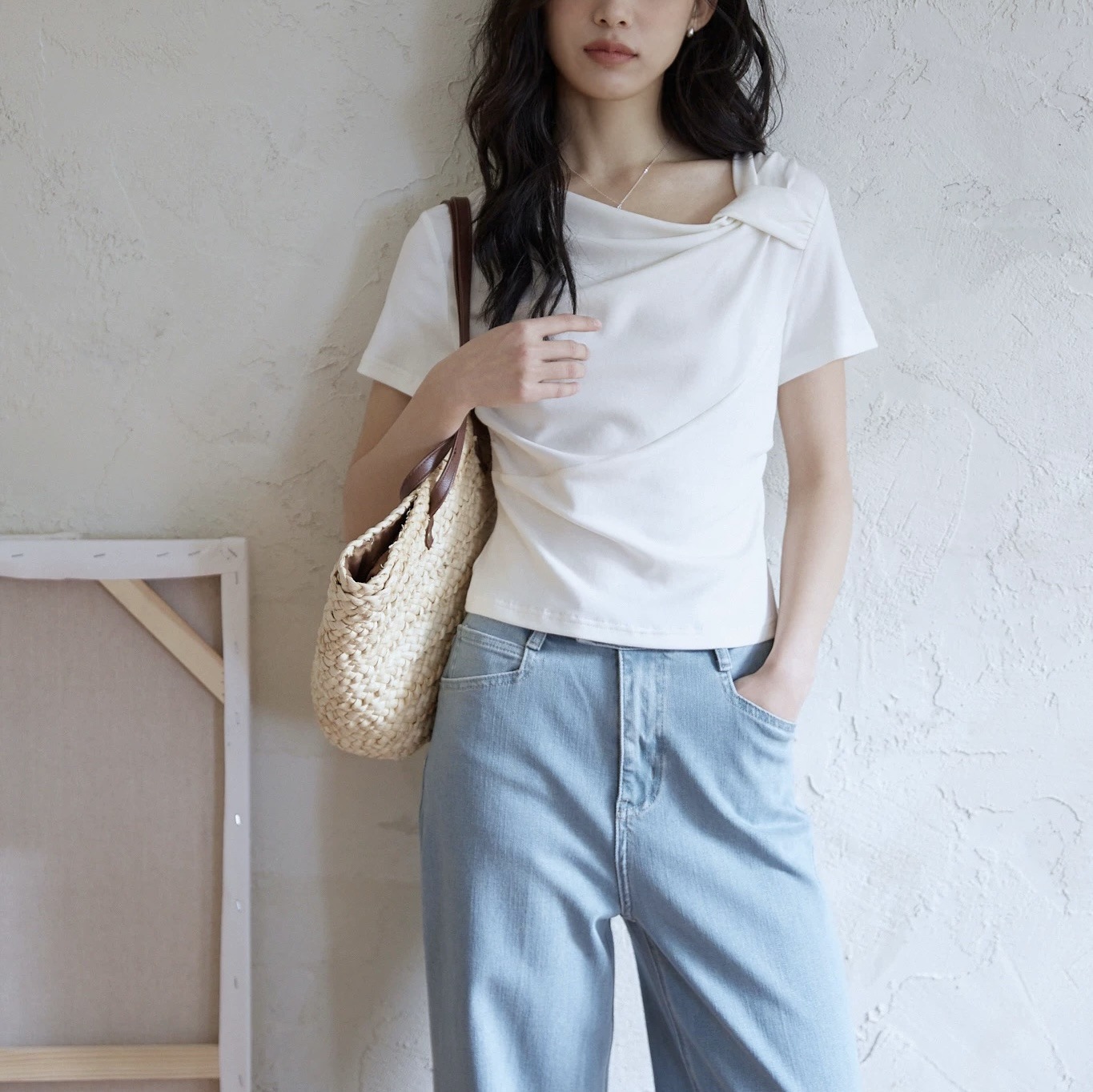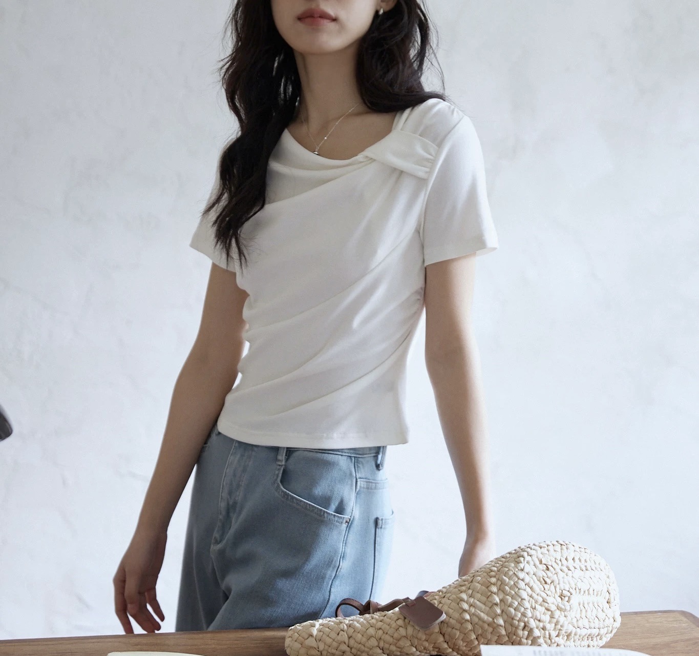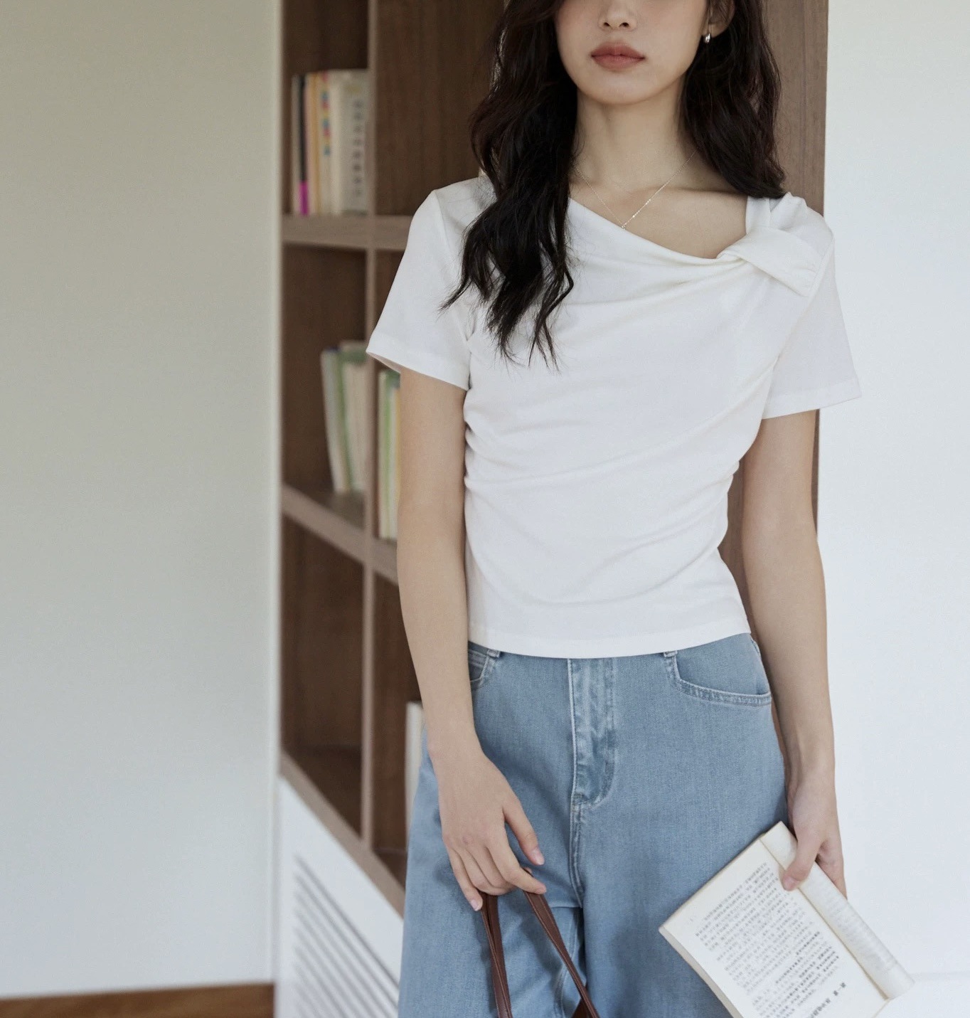 白色斜领纽结短袖T恤女夏款褶皱不规则设计感收腰正肩上衣