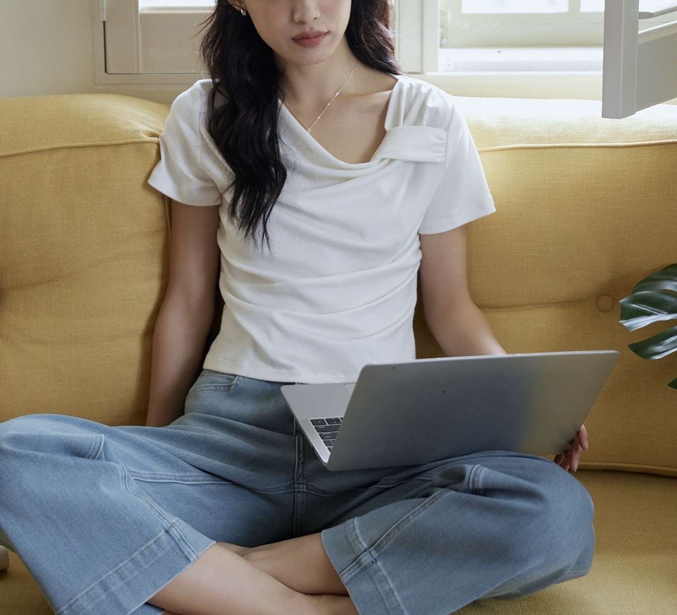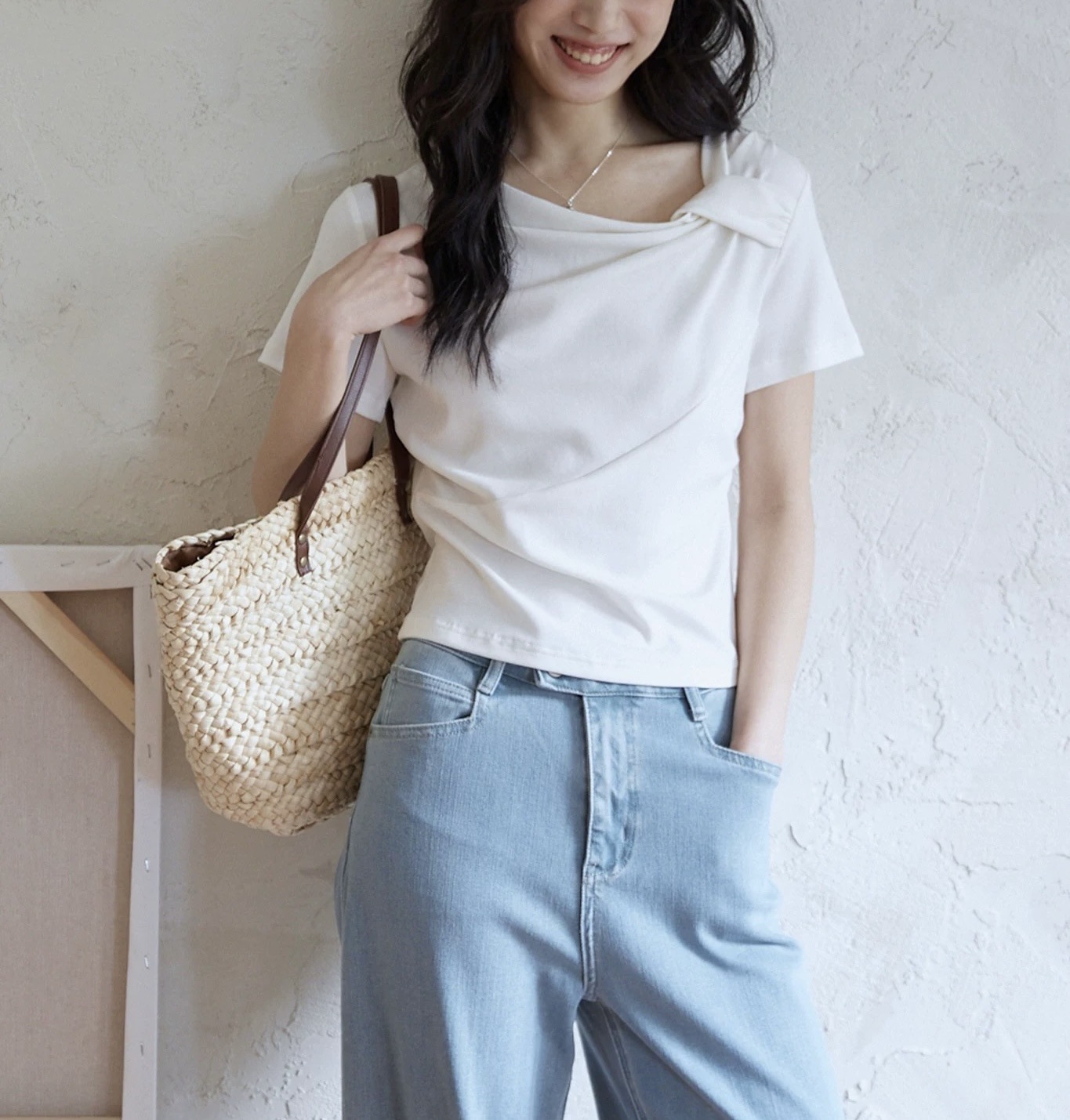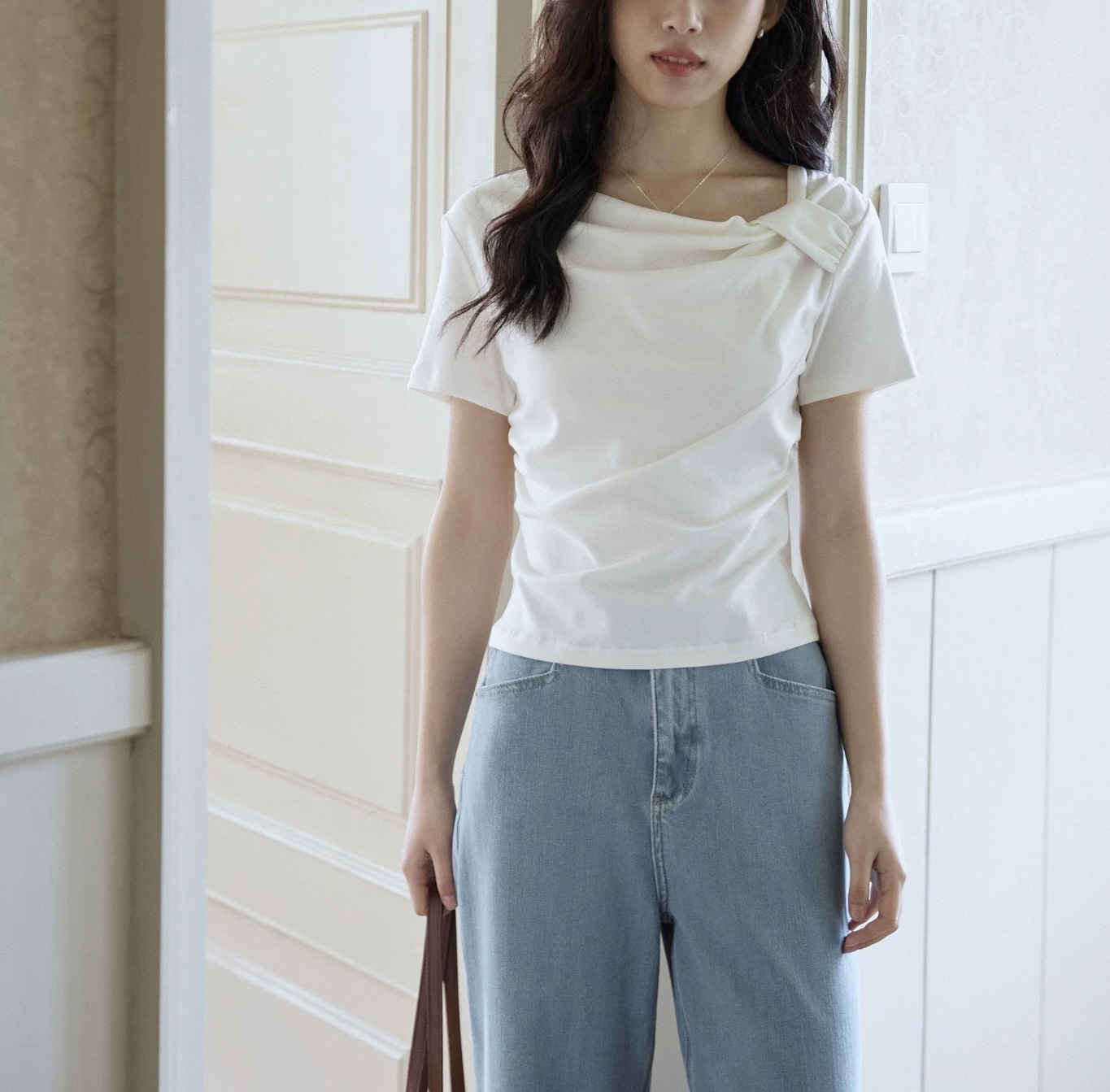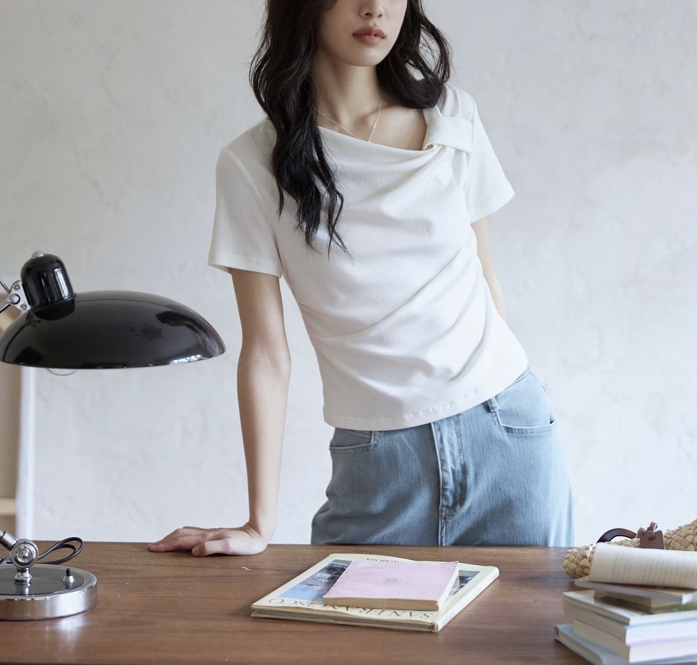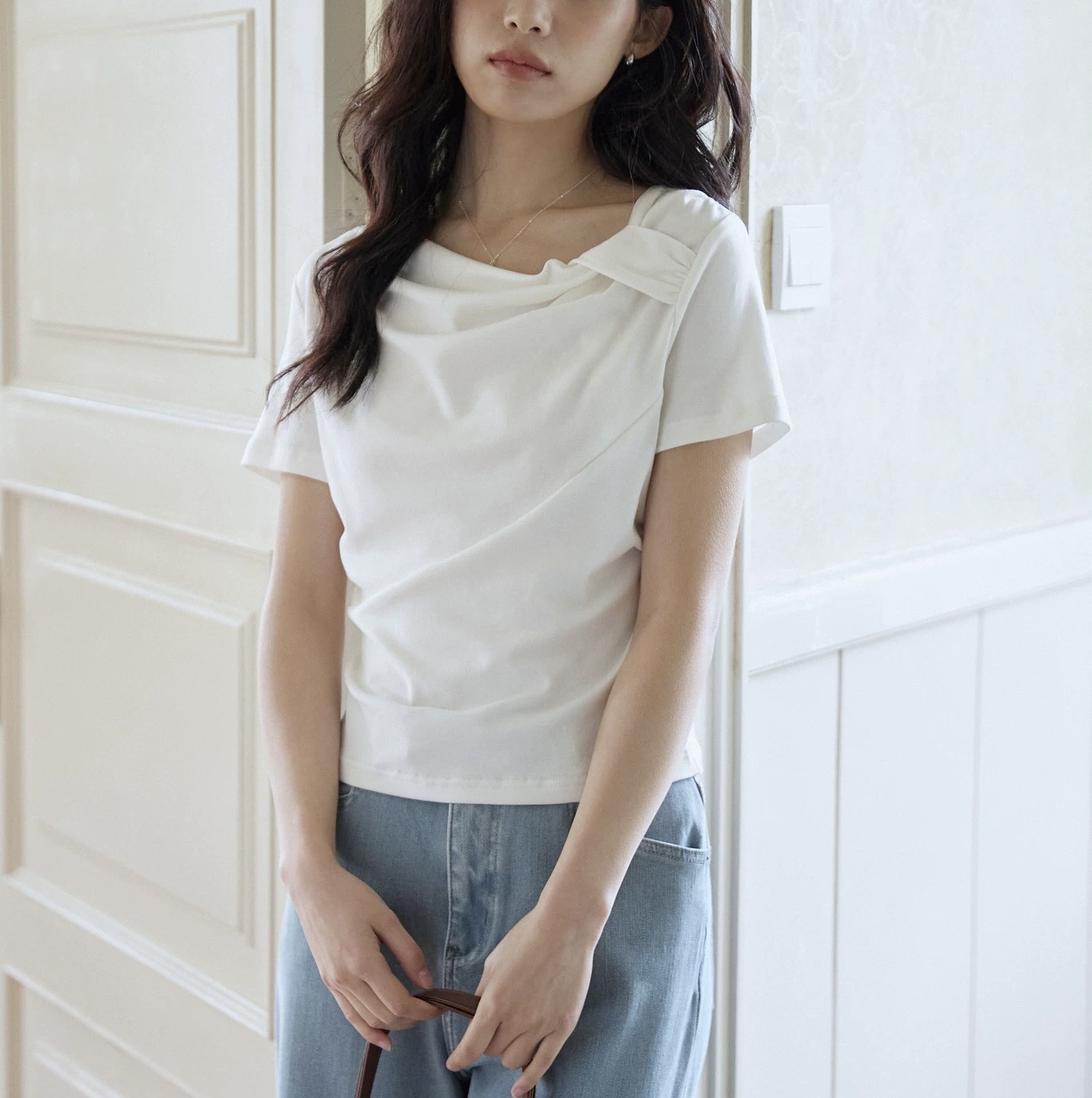 白色斜领纽结短袖T恤女夏款褶皱不规则设计感收腰正肩上衣