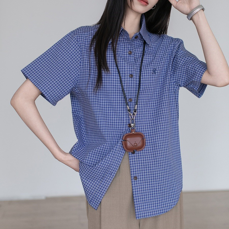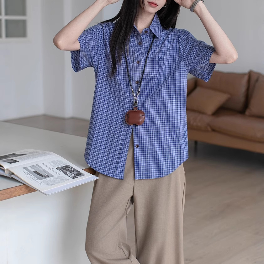 气质推荐~夏季女棉色织韩系复古百搭MIU系蓝色格纹短袖衬衫