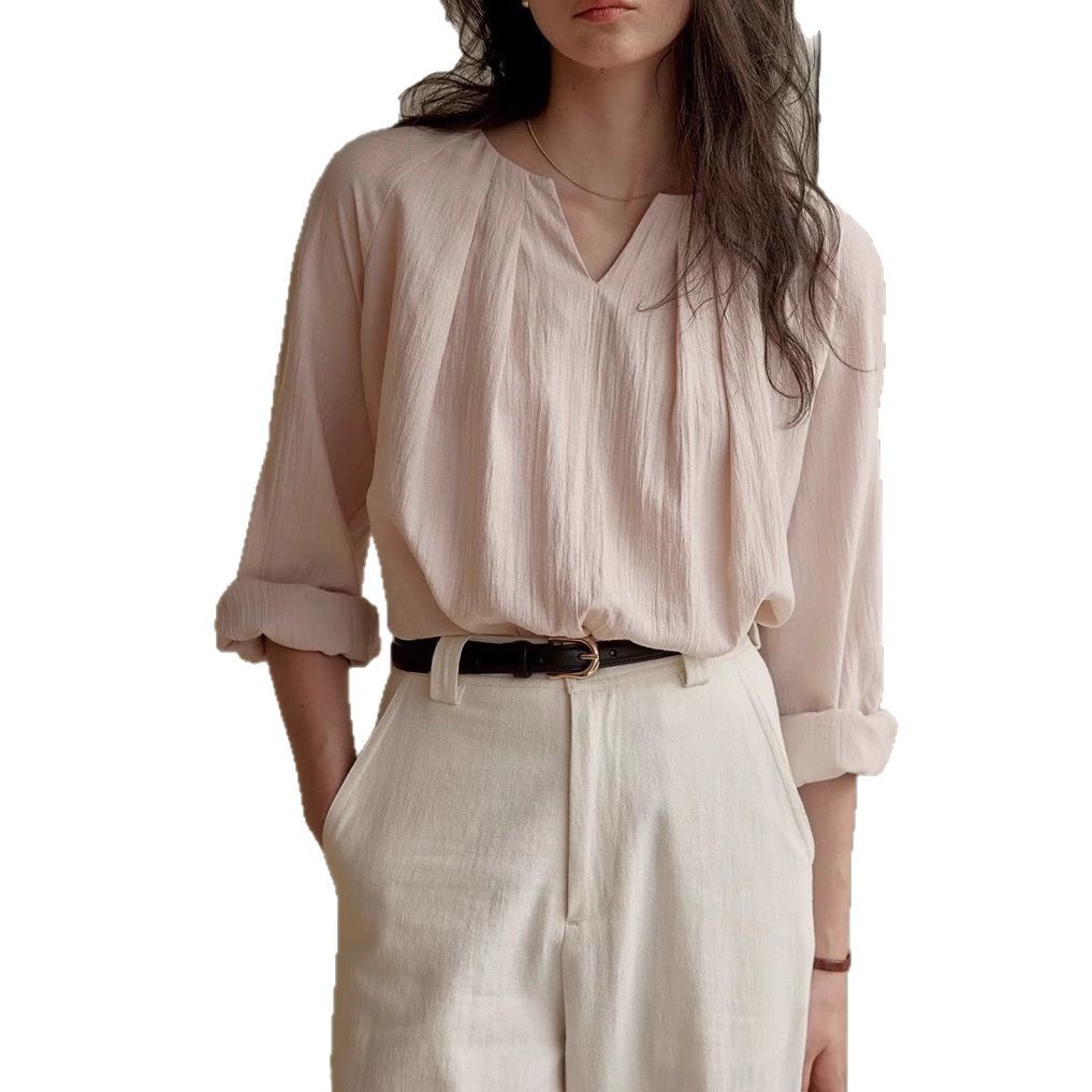 设计感简约裸粉色小V领气质舒适休闲宽松长袖衬衫女夏季新款