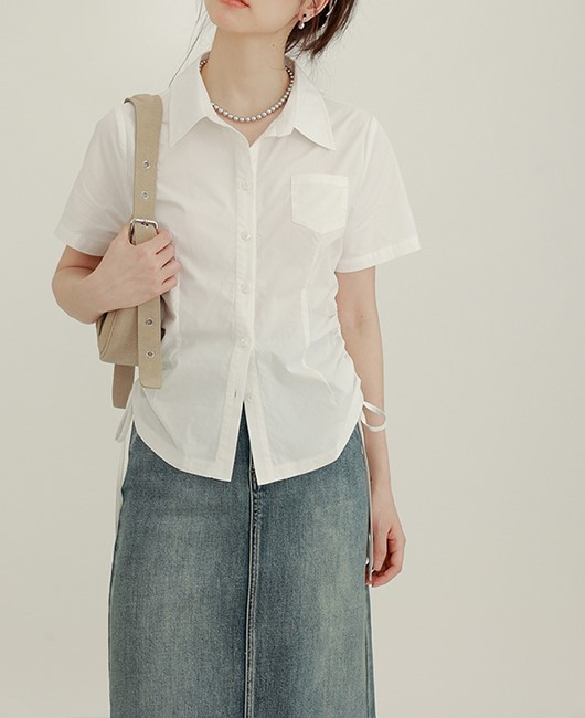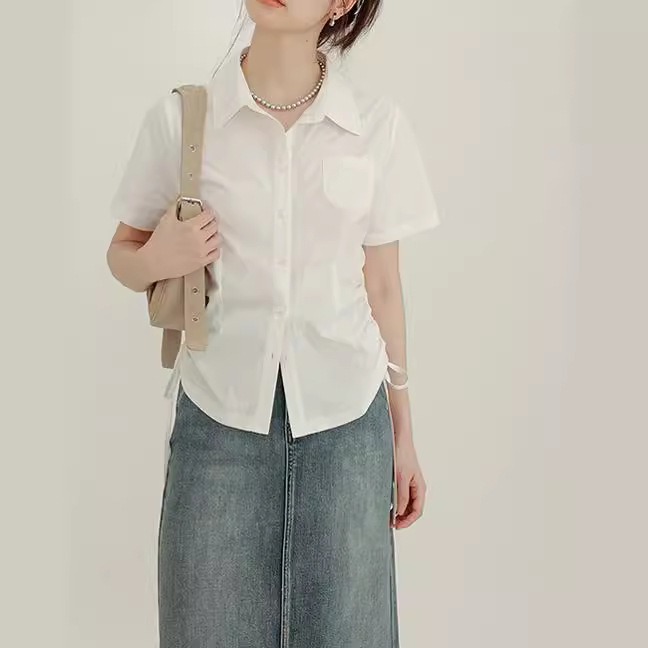 美式学院风侧腰抽绳设计感小众短袖衬衫女2025夏季纯色白色上衣