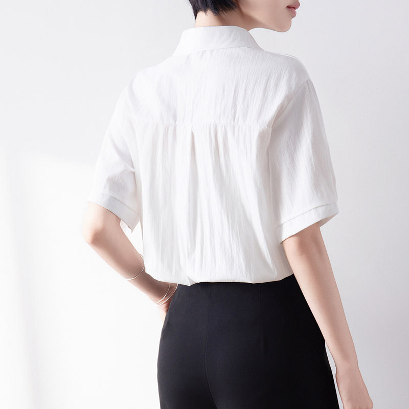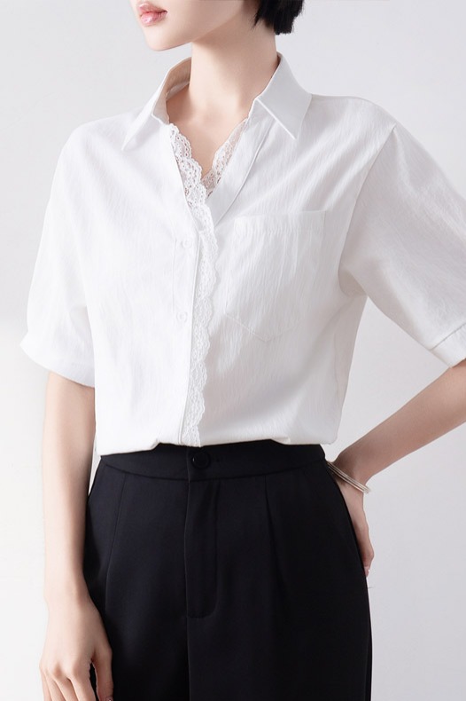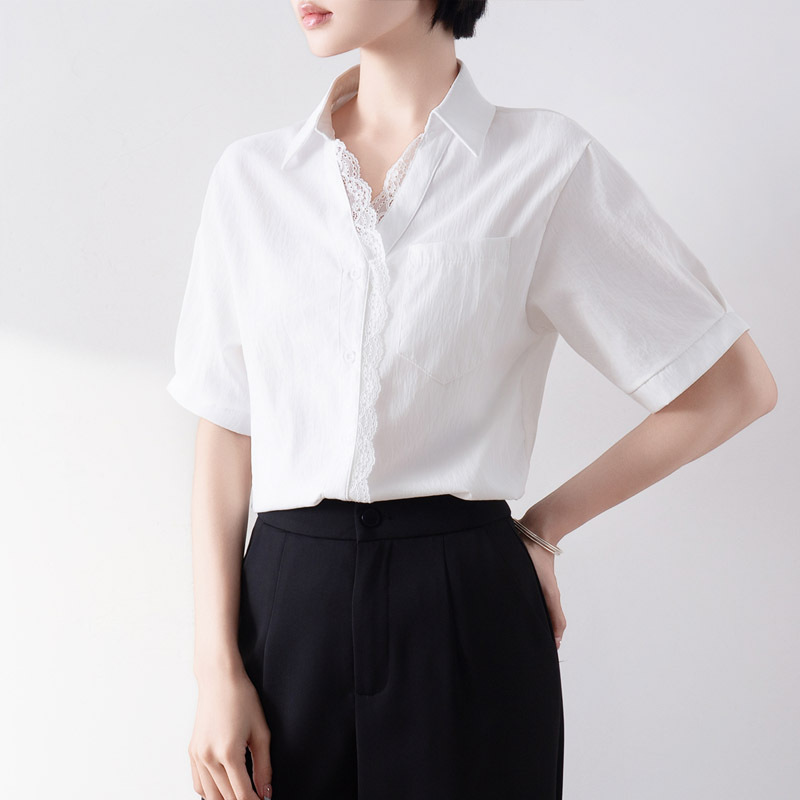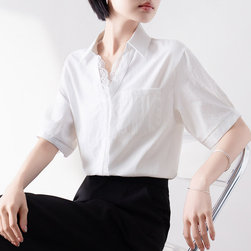 蕾丝花边拼接白色V领短袖衬衫女25夏季设计感休闲通勤上衣