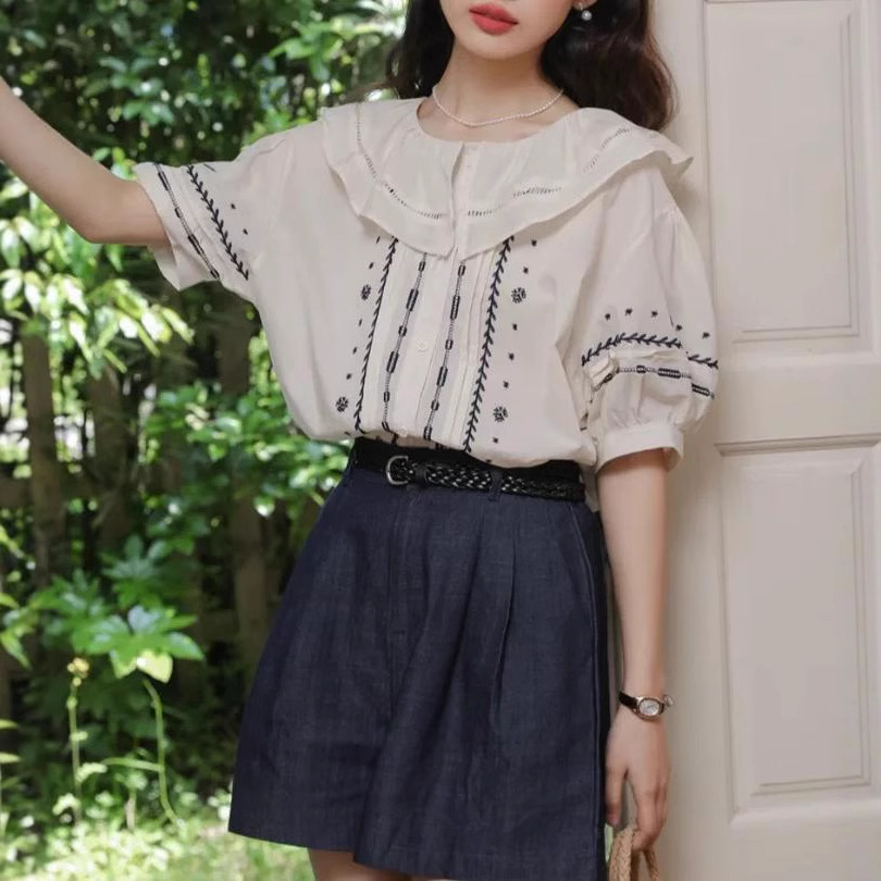 设计感小众法式复古高级感娃娃领刺绣镂空短袖衬衫上衣女夏新款