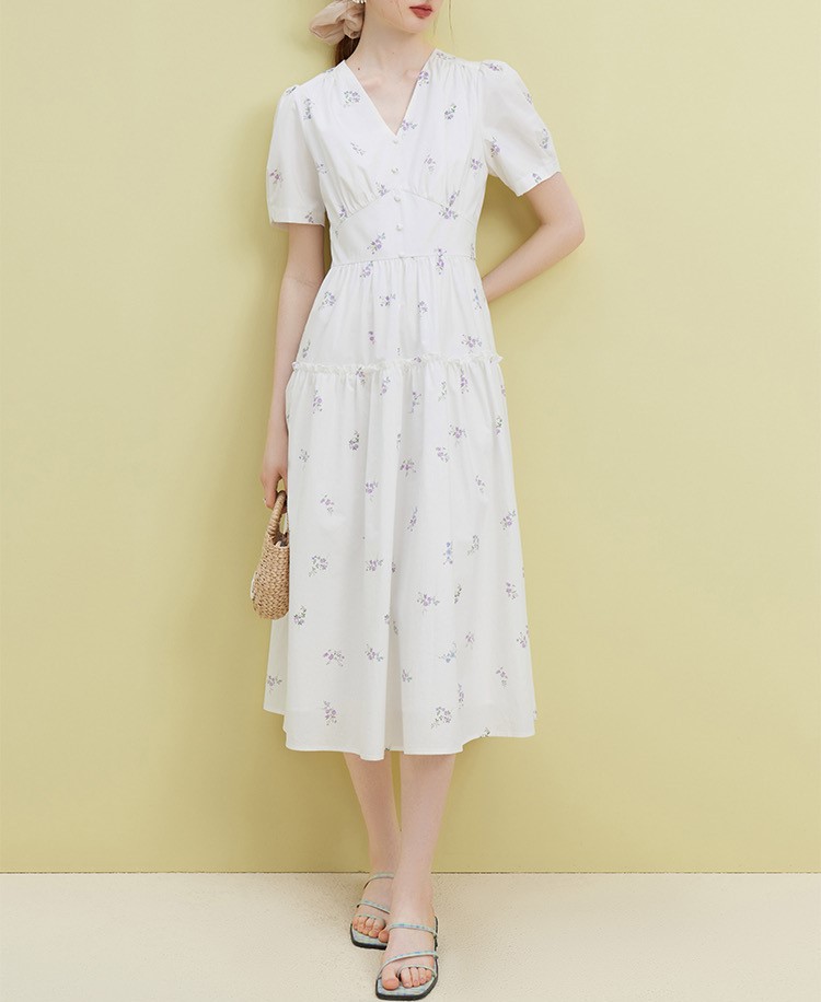 茶歇法式白色碎花连衣裙女夏季气质收腰显瘦V领长期