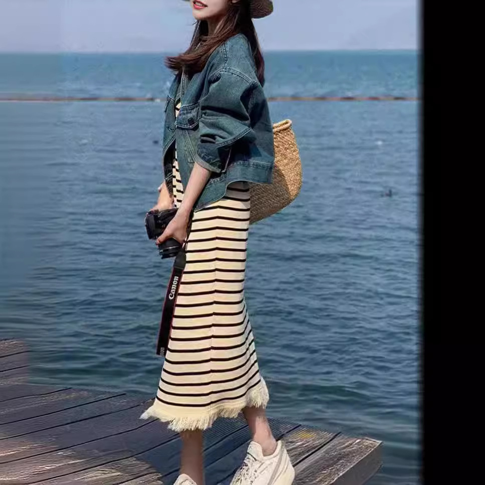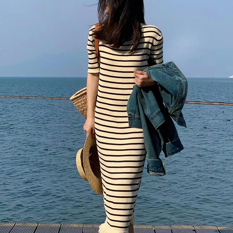 条纹T恤连衣裙女夏季2025新款遮肚子减龄高级感海边度假休闲长裙