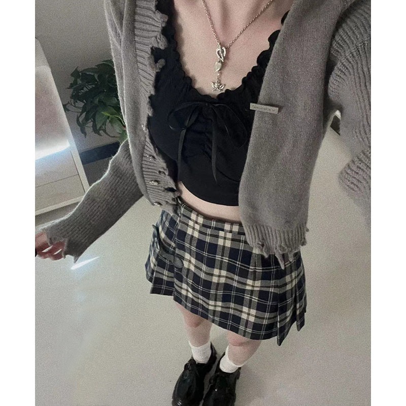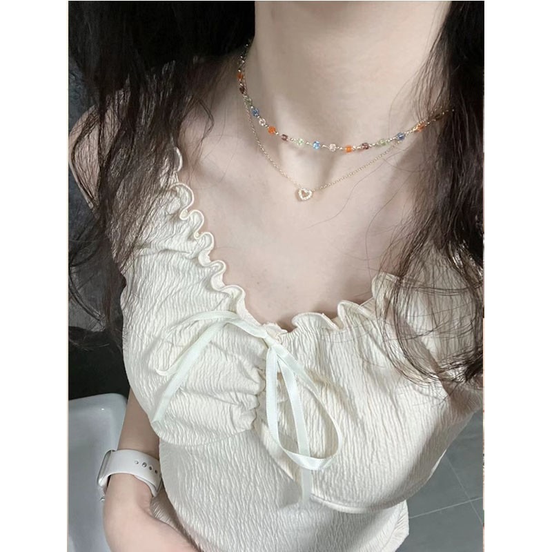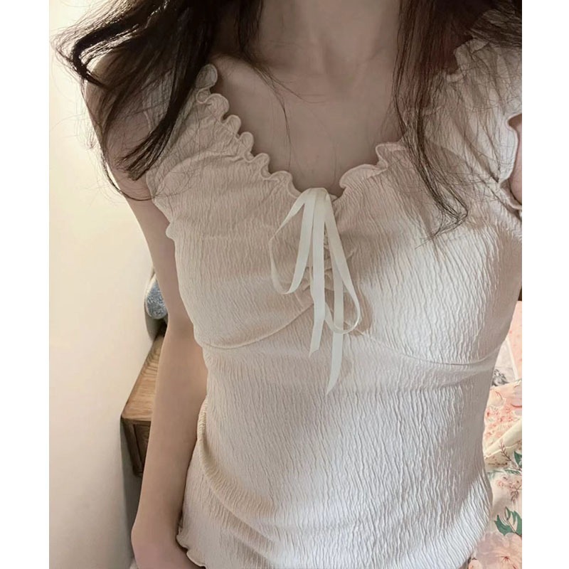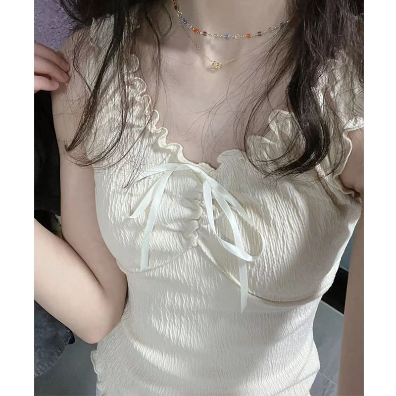 法式甜系辣妹BM风无袖吊带背心女木耳边蝴蝶结系带内搭上衣