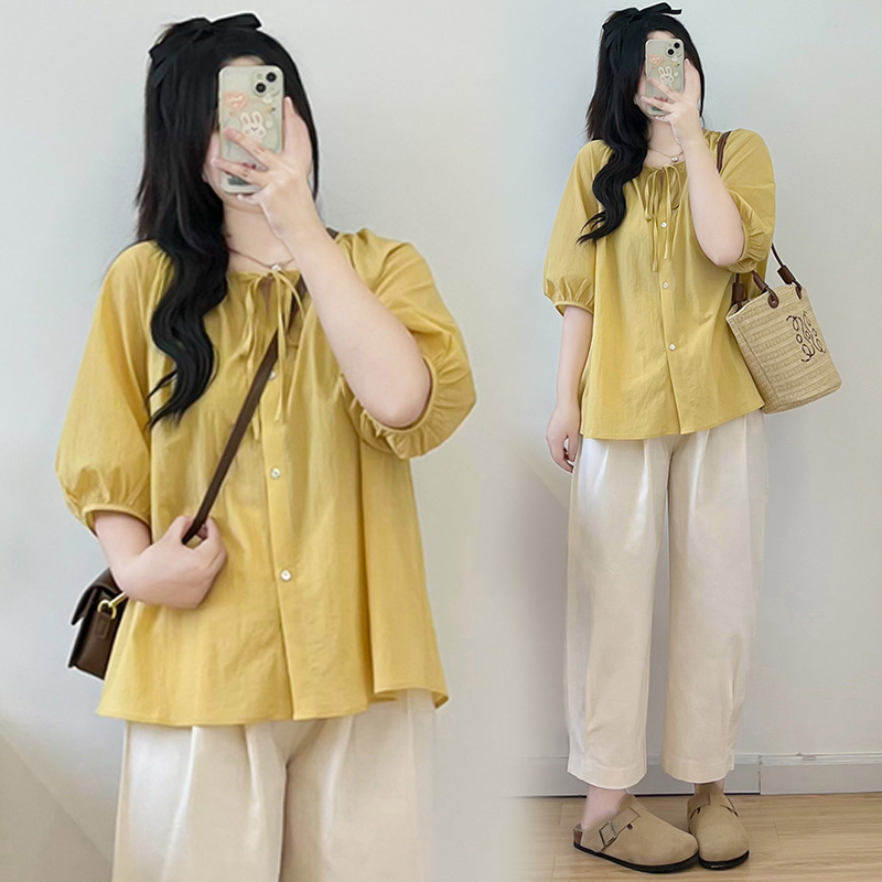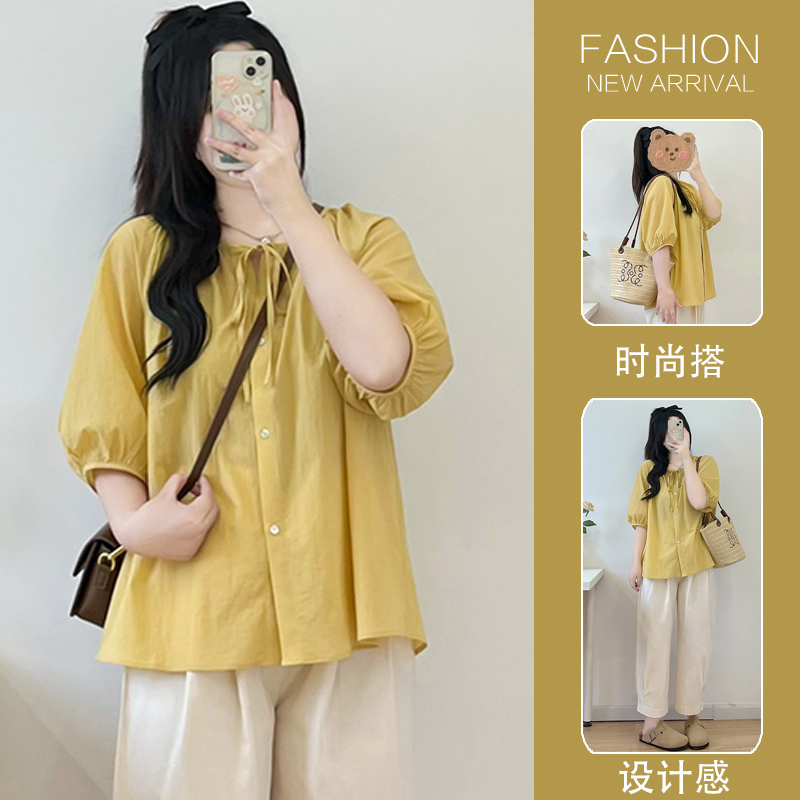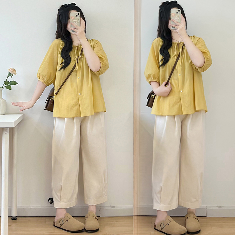 孕妇夏装套装时尚洋气宽松泡泡袖衬衫阔腿裤小个子孕妇装上衣夏季