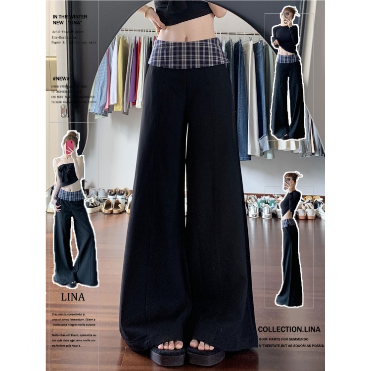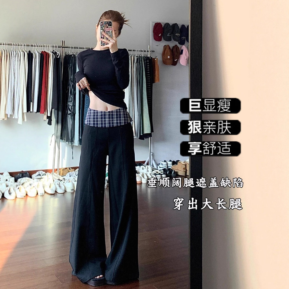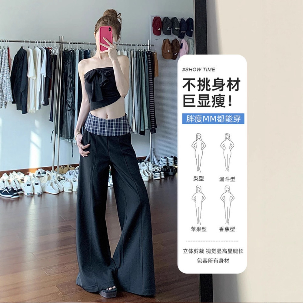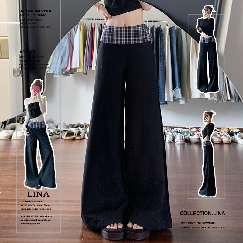 黑色格子拼接西装阔腿裤女2025新款设计感高腰显瘦宽松垂感休闲裤