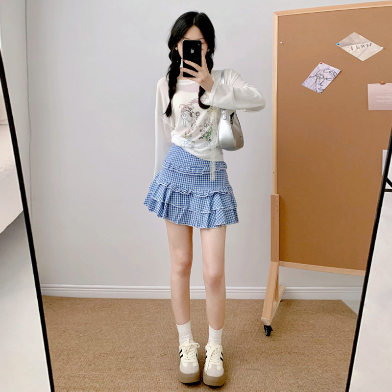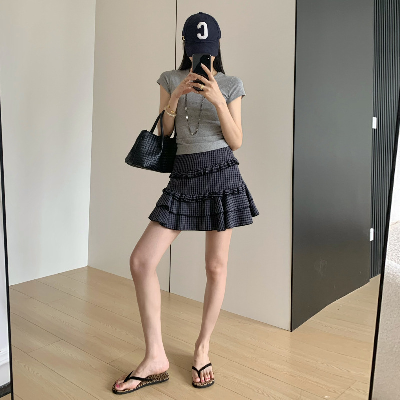 设计感格纹花边蛋糕短裙女夏季小众高腰百搭A字裙遮胯显瘦半身裙