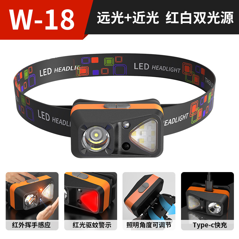 超亮头灯强光长续航充电感应头戴式多色警示灯轻便户外钓鱼头灯