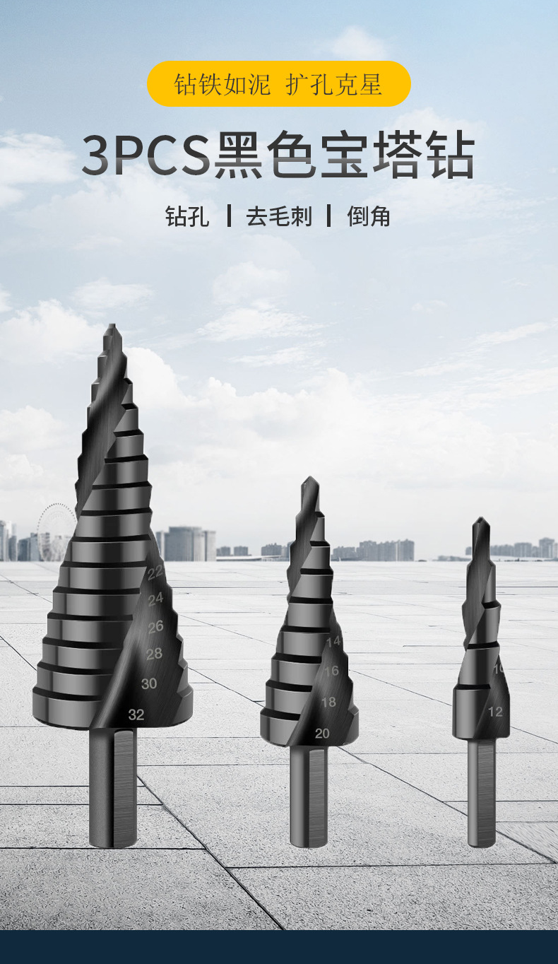 螺旋阶梯钻手电钻开孔台阶钻头套装黑色氮化打孔工具多功能宝塔钻